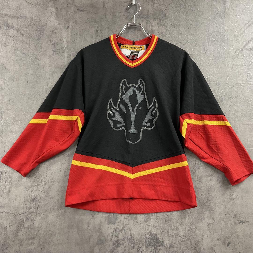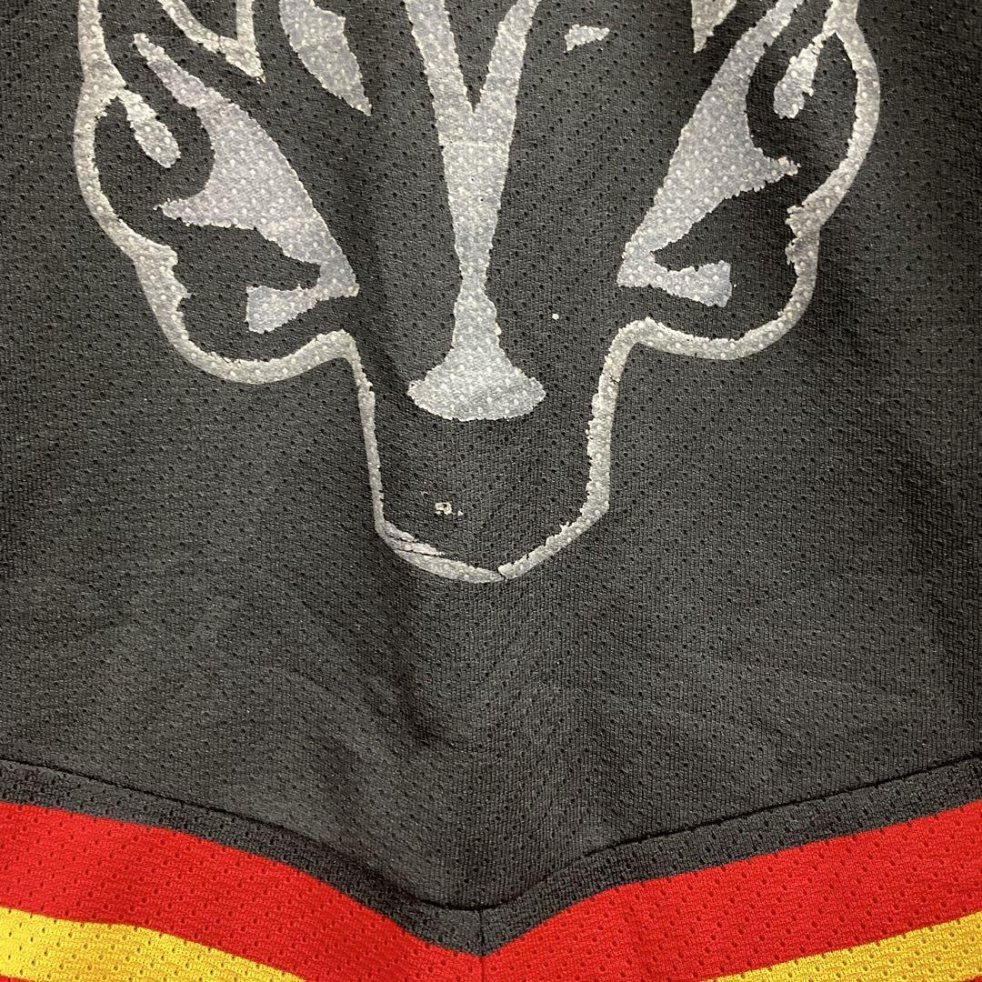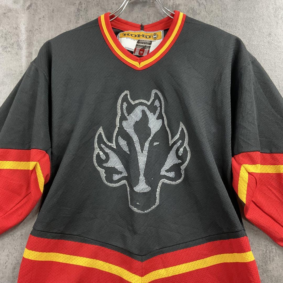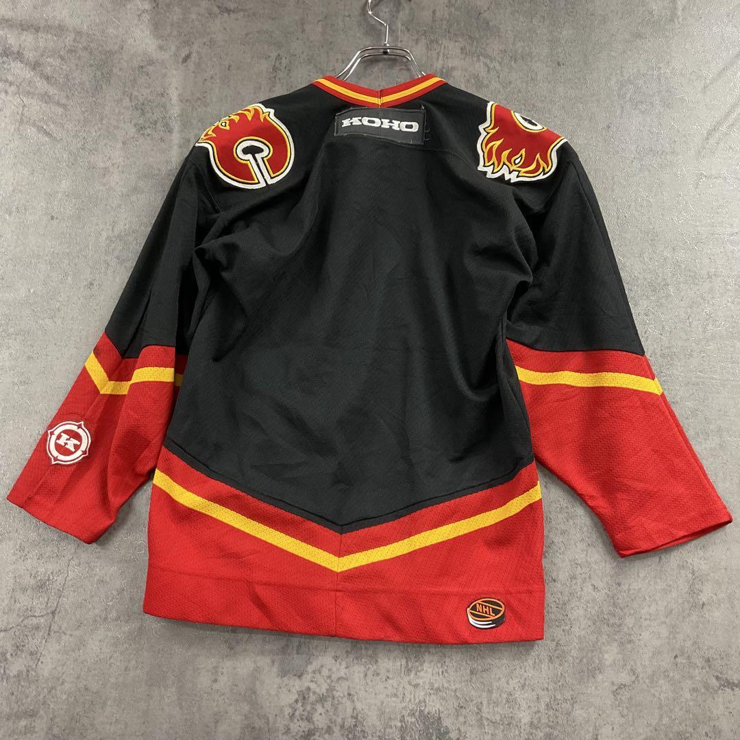 NHL公式サプライヤーKOHO製、カルガリーフレームスのアイスホッケージャージ。ブラックを基調にレッドとイエローのチームカラーが映える一着で、フロントにはオルタネートロゴ、袖にはフレイムスのクラシックロゴ入り。コレクションやスポーツ観戦、ストリートコーデにも最適な存在感あるアイテムです。