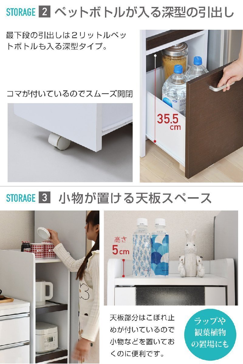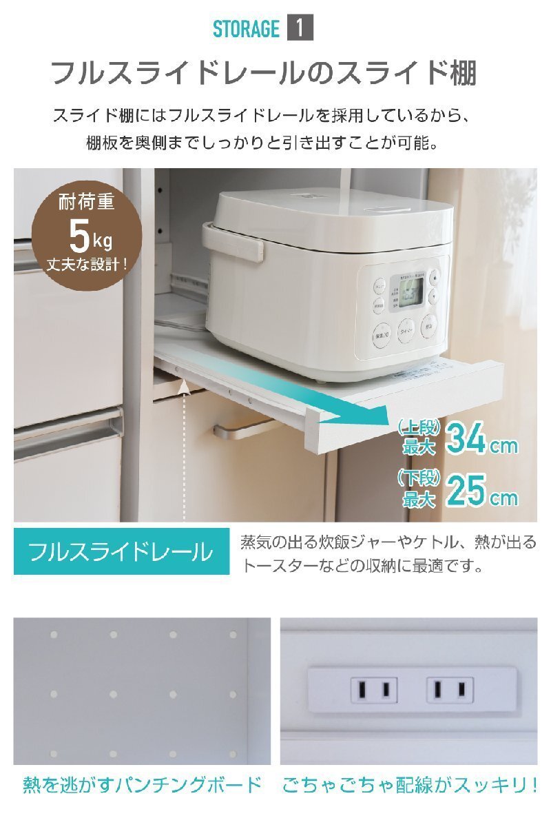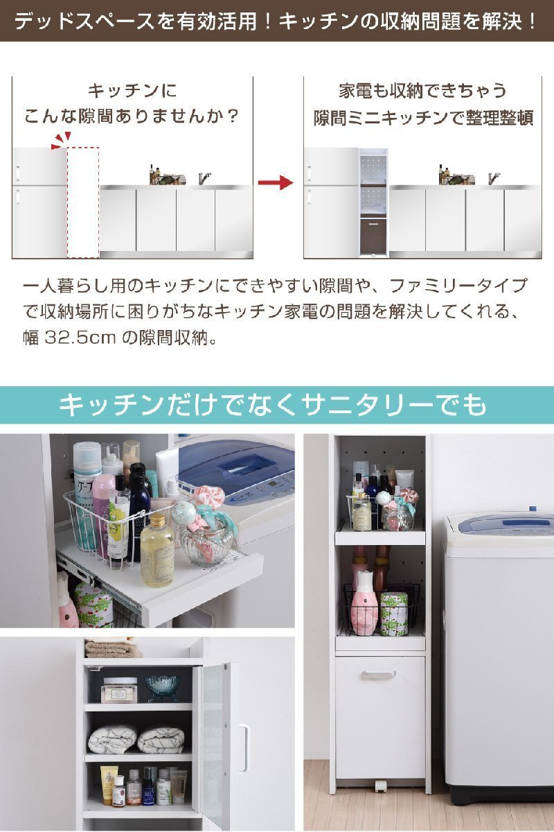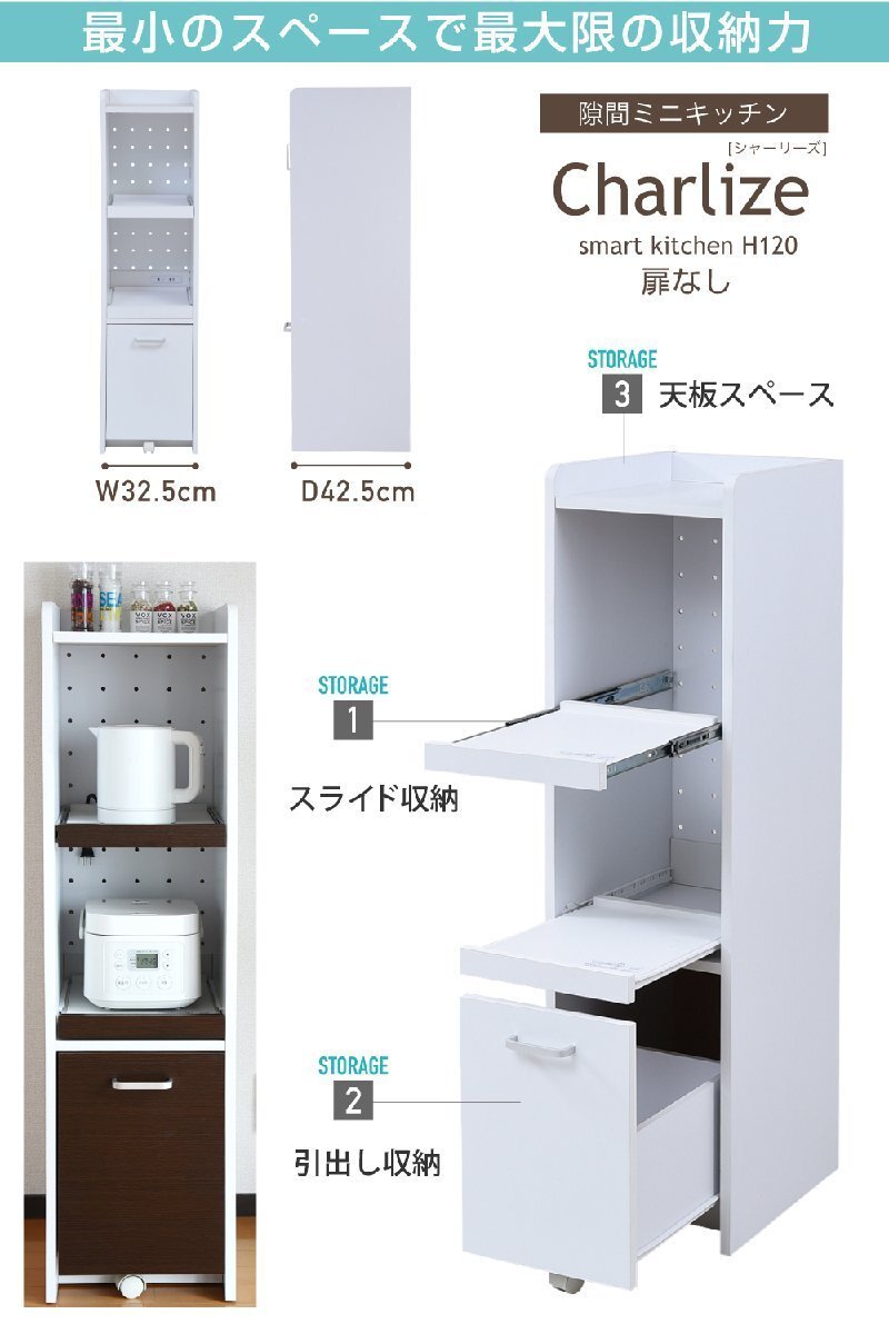 ■商品説明 隙間タイプのキッチン収納。ちょっとした隙間や収納スペースにお困りの方にぴったりな、スリムタイプの家電収納家具。家電が2台収納できる、高さ120cm |