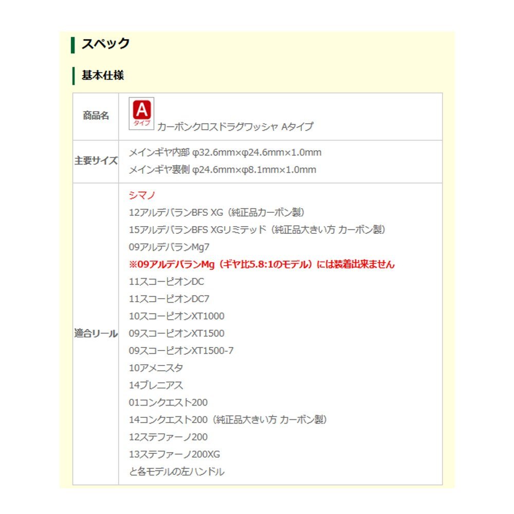 シマノ社製、五十鈴工業社製、ABU社製ベイトキャスティングリールに広く対応する、カーボンクロスドラグワッシャです。純正のドラグワッシャに比べ、滑り出しの特性に優れたカーボンクロスドラグワッシャに交換することにより、ライトラインでビッグフィッシュがヒットした時などに安定したドラグの滑り出しを可能にします。※ドラグマックス値は純正品より小さくなる場合があります。狙う対象魚やタックルなど用途に合わせてご使用下さい。弊社製品に交換することによって、ドラグワッシャ周辺のパーツの摩耗が早く進む可能性があります。予めご了承下さい。●取り扱い上の注意!この製品は、リールに組み込むためのものです。それ以外の目的で使用しないで下さい。この商品はカーボン繊維を多く含む材料から製作しております。直接肌に触れますと、痛みやかゆみを生じることがありますので、取り扱いや保管にはご注意下さい。なお、痛みやかゆみを感じる場合は、水またはお湯で洗い流して下さい。