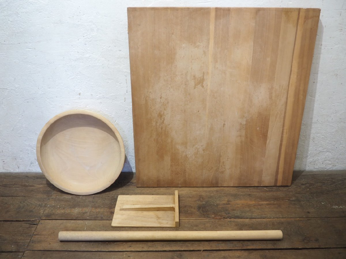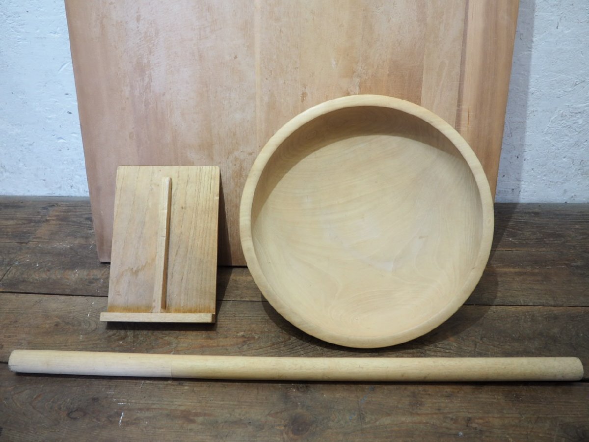 レトロな古いこね鉢、のし板、麺棒、こま板の4点セットです。