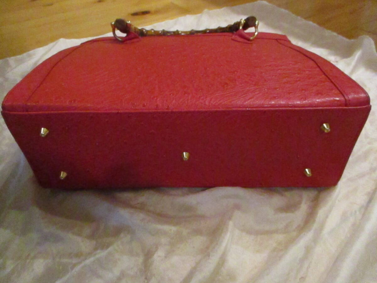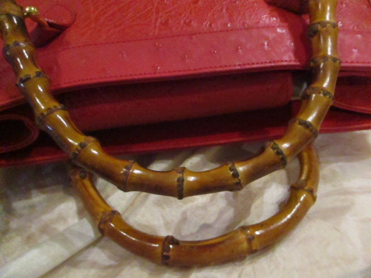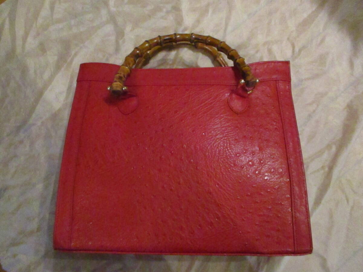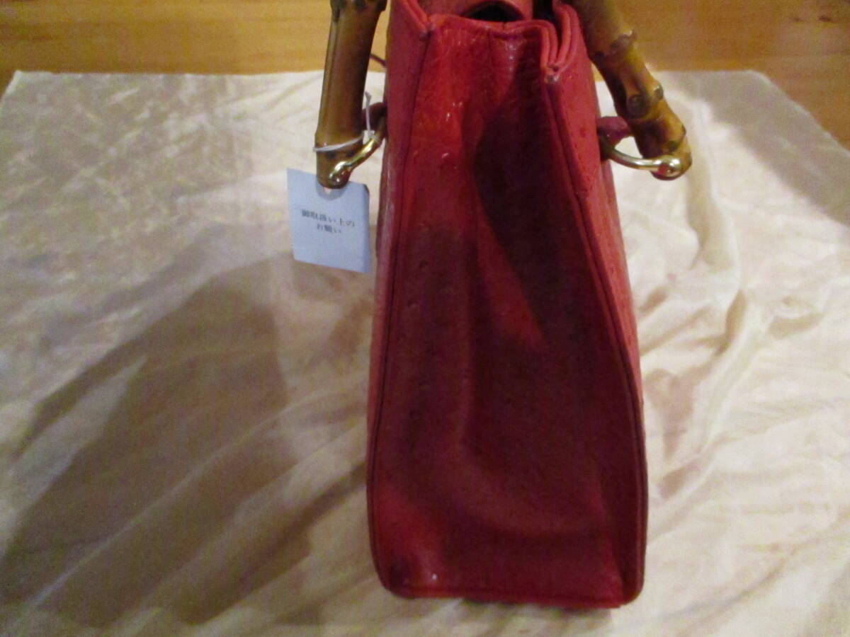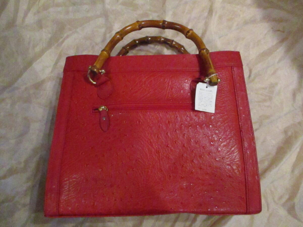 □お洒落♪天然バンブーハンドル オーストリッチトートバッグ ハンドバッグ レッド 本革 リアルレザー 未使用保管品□ | |||||||||||