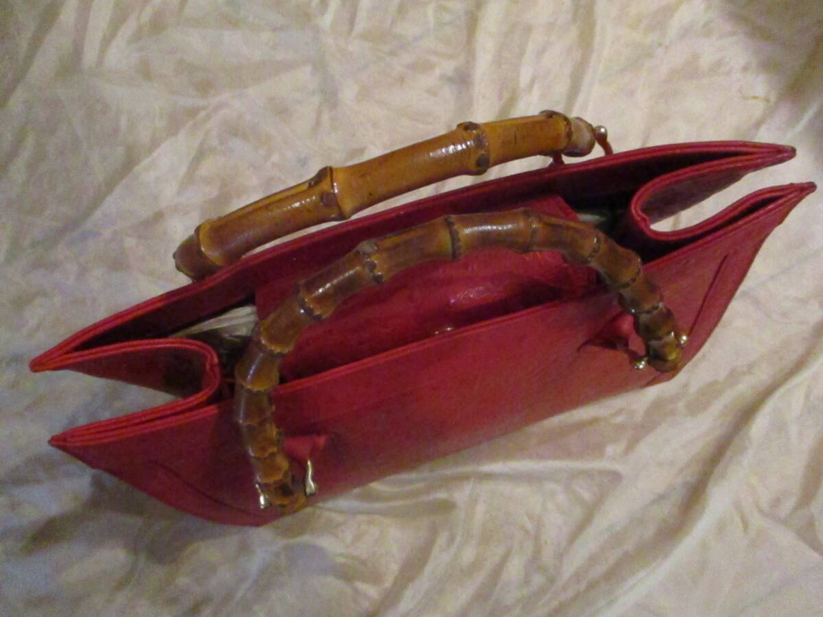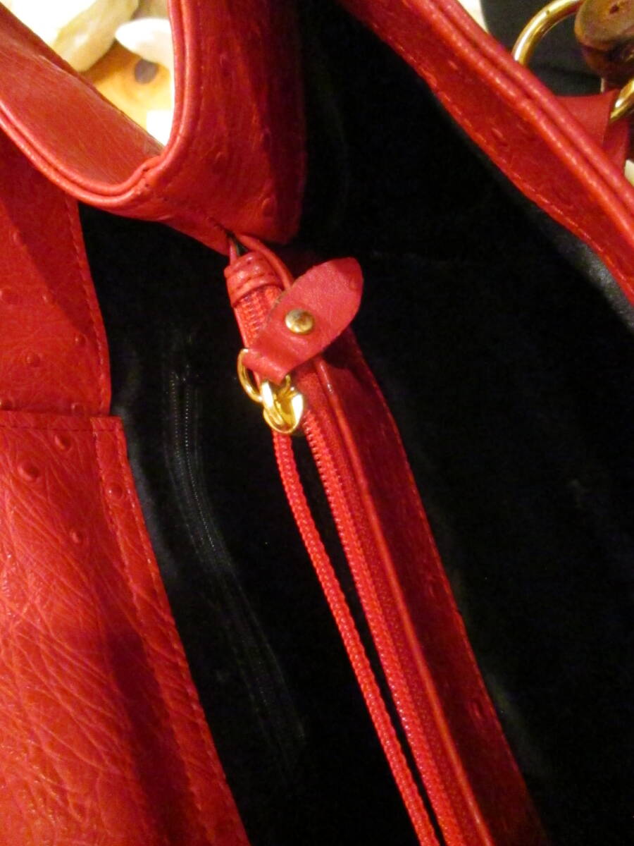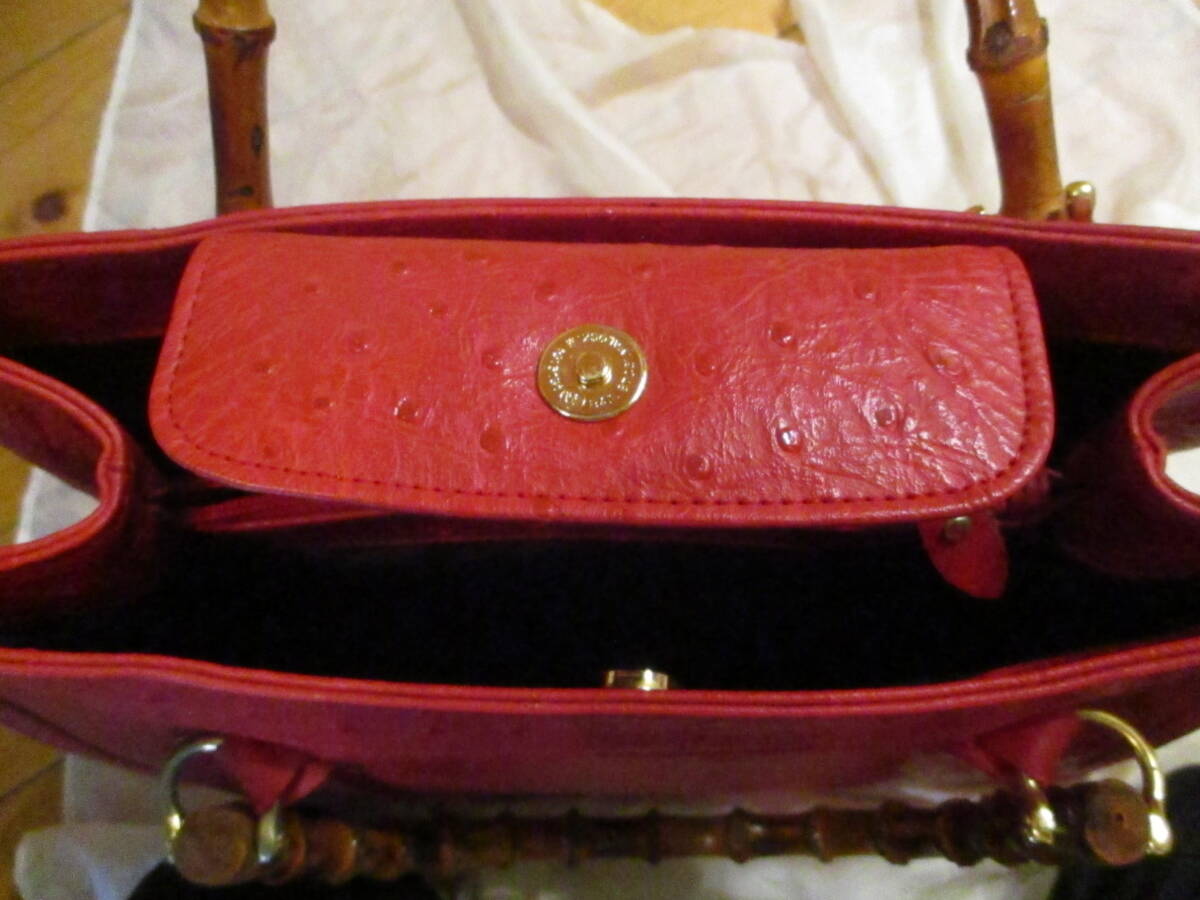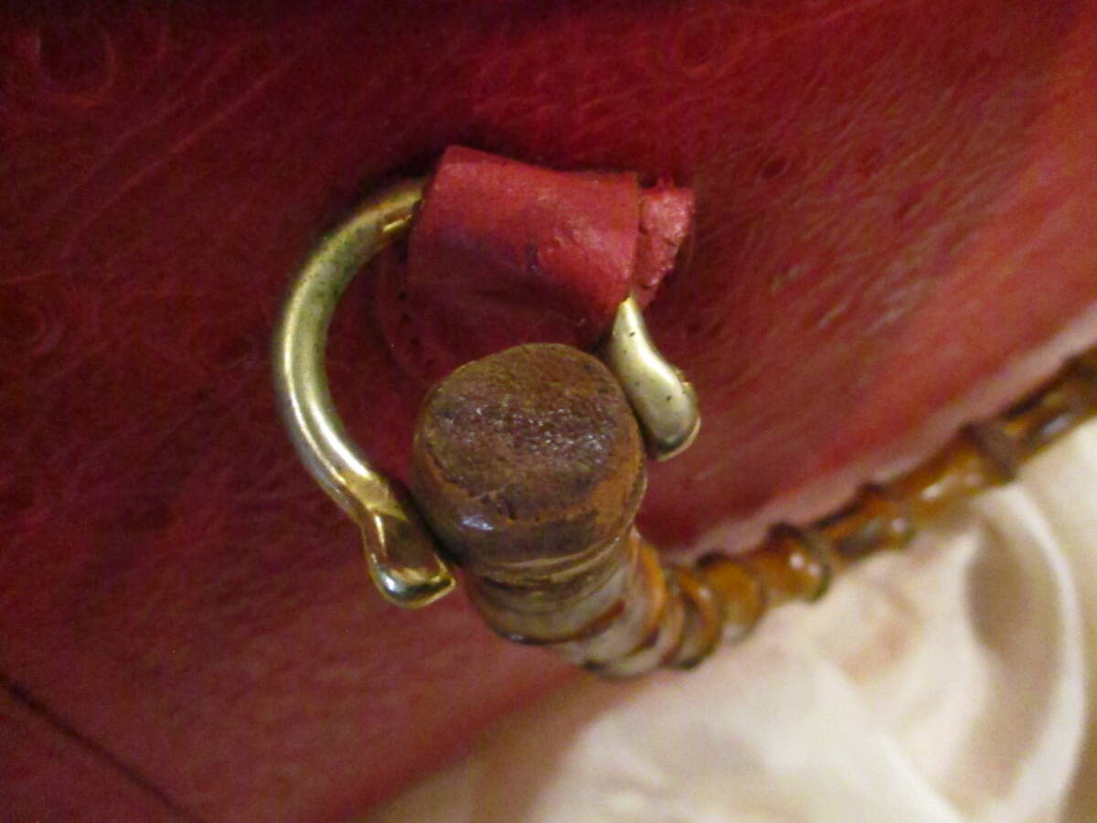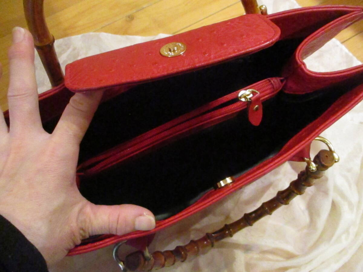 □お洒落♪天然バンブーハンドル オーストリッチトートバッグ ハンドバッグ レッド 本革 リアルレザー 未使用保管品□ | |||||||||||