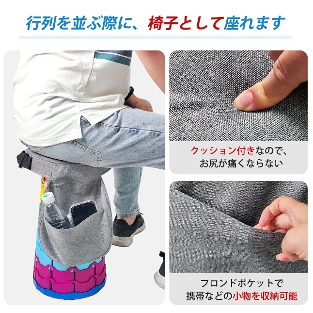 使い方超簡単:指をスツール両辺の穴に挿して、ひねりながら伸ばして、好きな高度に引いて回転して固定します。逆方法に少しひねりを入れながらスツールの両端を押すだけで一瞬で収納可能です。ショルダータイプに持ち運ぶ時は、チェアの側に回るロップがあるので肩にかけ持ち運べるから本当に便利です。