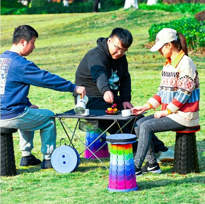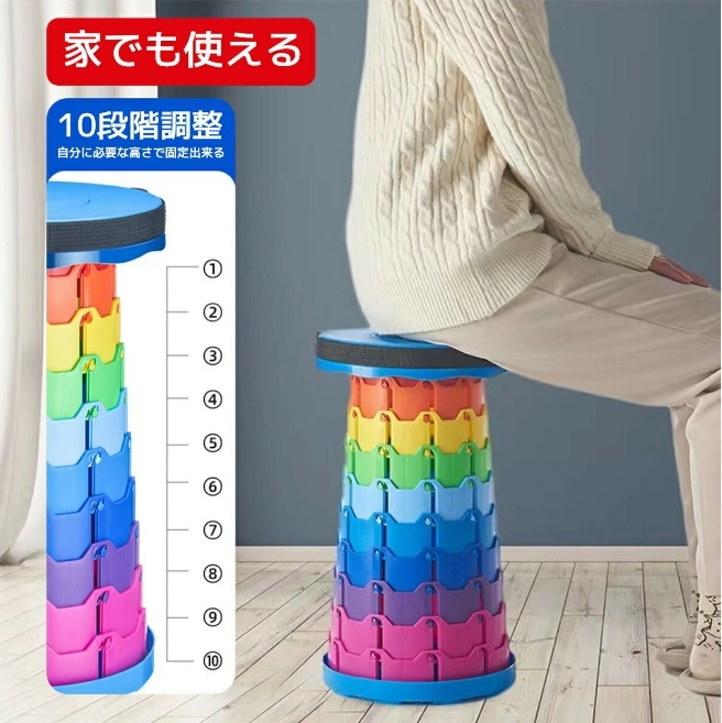 独特な折畳設計&一秒開閉できる:一瞬でスツールを引き出し・収納可能。展開する前にはまるいバックの形で、全然チェアの様子に見えないです。展開する後は高度45cmの椅子になり、更に好きな高度(10段階)を選択して回転して調節できます。