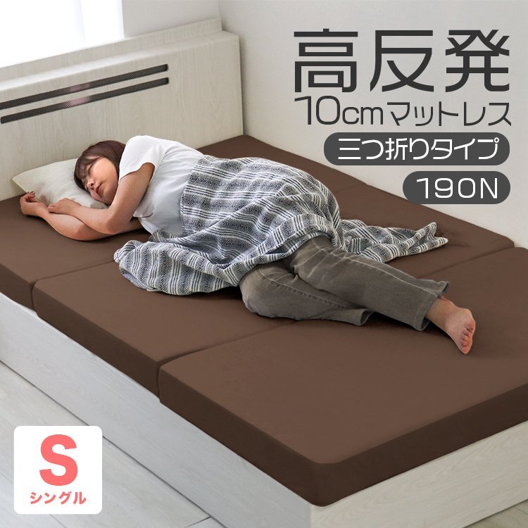 腰をやさしく支える高反発マットレスです。 厚みたっぷり10cmで、1枚でも底付き感のない寝心地。 高反発マットレスは下からの跳ね返りの力により、沈み込みが少ないのが特徴です。 その為、寝返りがうちやすく就寝時の身体の一部分(首・肩・腰・足)にかかる体圧も分散。 寝返りが多い方や仰向けに寝ることが多い方にオススメです。 三つ折りタイプは、押入れなどに収納しやすく、立て掛けておいても場所をとりません。 カバーは取り外して洗濯することができます。 【商品仕様】 ・カラー:ブラウン ・サイズ:(約)195cm×97cm×10cm(シングルサイズ) ・重量:(約)5.8kg ・硬さ:190ニュートン ・素材: マットレス本体:高反発ウレタン カバー:ポリエステル100% 【注意事項】 ・圧縮梱包されたままの状態で長期間保管した場合、マットレスが復元できなくなってしまいます。商品到着後、1週間以内に必ず圧縮から開放をして頂くようにお願いいたします。 ・マットレスは約1-2日で復元します。気温や温度により3-14日かかる場合もあります。 ・製品の臭いが気になりましたら、風通しの良いところで脱臭してください。この臭いは素材のウレタンによるもので無害です。臭いに敏感な方は十分ご検討の上、ご購入をお願いいたします。 ・マットの硬さは温度によって変わってきます。また、硬さの感じ方には個人差があります。 ・カバーは取り外して洗濯ができますが、マットレス本体は洗濯しないでください。 ・仕様・デザインは改良のため予告なく変更することがあります。 |