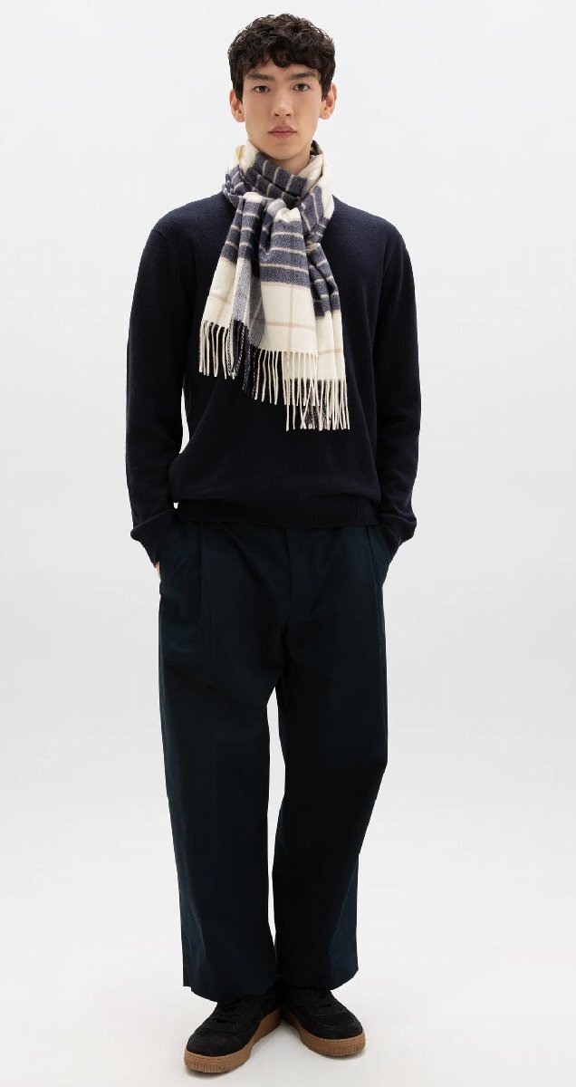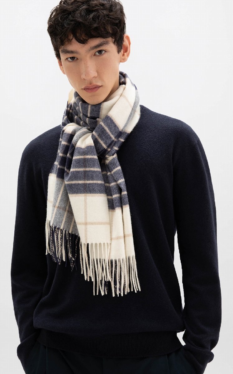 秋冬の温もり感あるブラウン系マルチカラーのタータンチェック柄が、センス良く見せてくれるでしょう。ドレススタイルにリッチなアクセントとして垂らしてつけてもいいですし、休日ニットにこのマフラーを巻いて、車で買い物や食事に出掛けるのもエグゼの洒落カジュアルです。