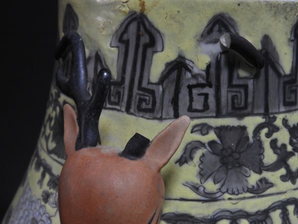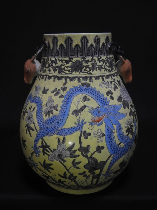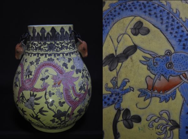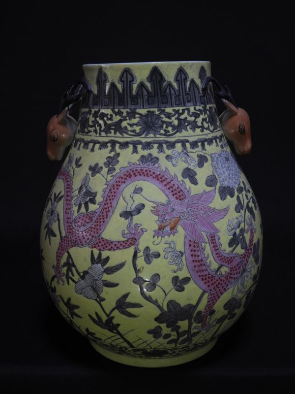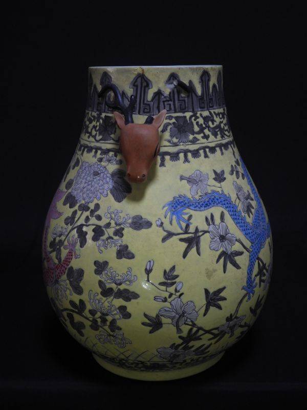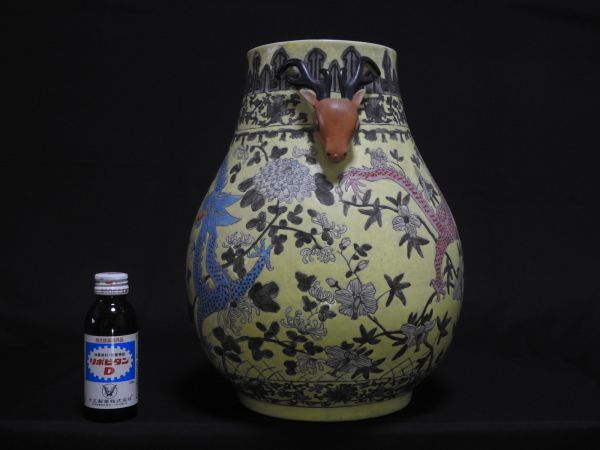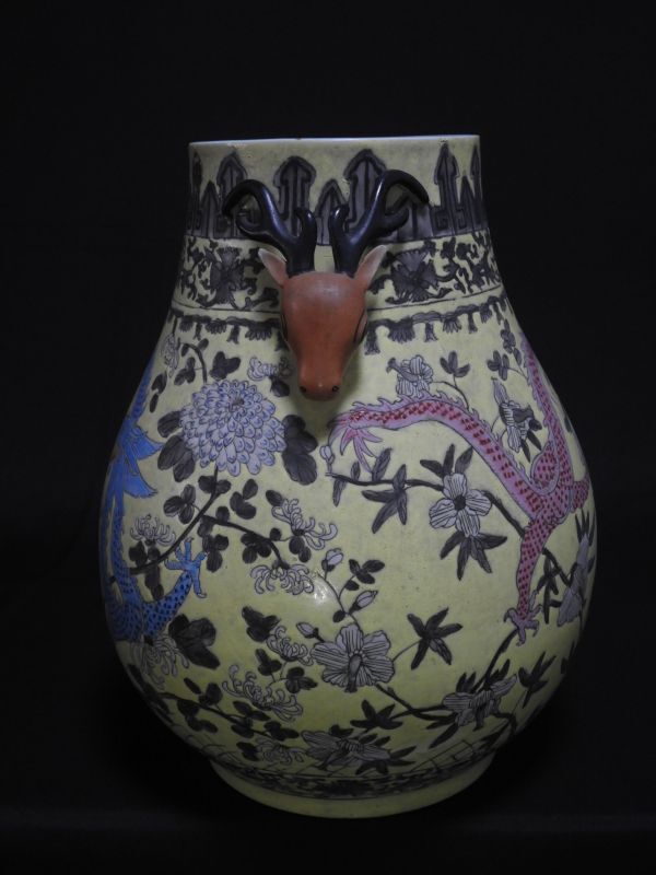 壺 龍花鹿図 五本爪 中国美術 高さ約 31 花器 置物 飾 【送料無料】