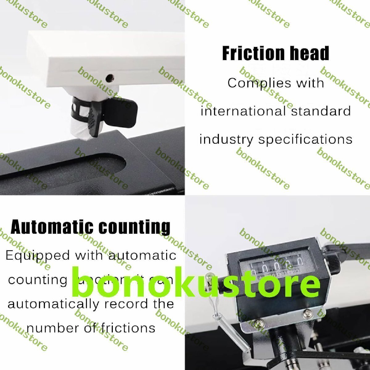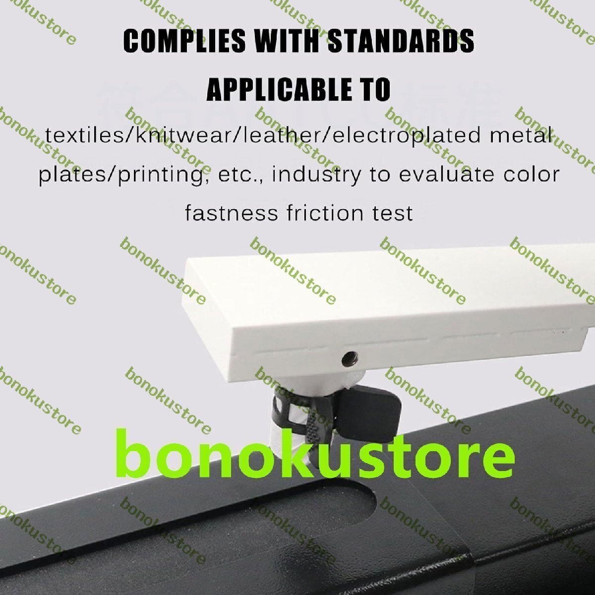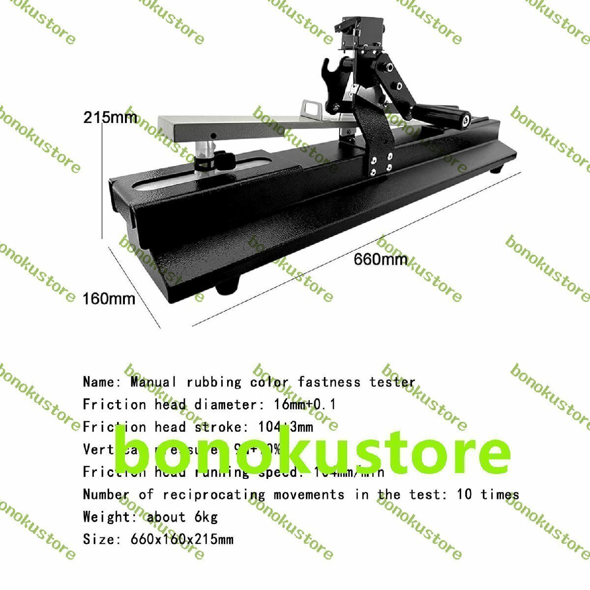 商品説明 商品の説明 名前: 手動摩擦堅牢度試験機 フリクションヘッド径:16mm+0.1 フリクションヘッドストローク:104+3mm 垂直圧力:9N+10% フリクションヘッド走行速度:104mm/min 試験往復回数:10回 重量:約6kg サイズ: 660x160x215mm 名前: 手動摩擦堅牢度試験機 フリ