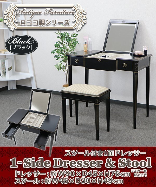 | 商品名 | 送料無料 ロココ調 ドレッサー スツール セット 天板サイズ約W90×約D45cm ブラック ドレッサーデスク 収納 化粧台 鏡台 メイク台 鏡 ミラー 机 テーブル 木製 椅子 イス チェア 一面 1面 コスメ 小物 アンティーク インテリア 家具 リビング おしゃれ 黒 rococof109113bk |