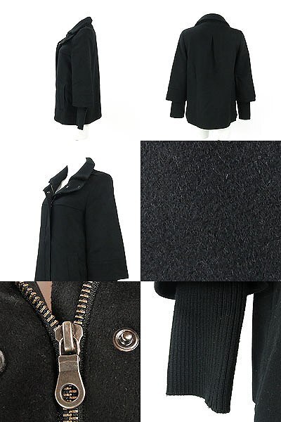 スタンドカラーのショート丈コートでスッキリ感♪ ジップアップタイプの比翼仕立てでフロントも大人っぽく。 やや裾広がりで女性らしいシルエットを描きます。 リブ袖はボタン着脱で取り外しが可能ですよ☆ 首や袖などに毛羽立ちがみられるなど、やや着用感が残っています。 着丈約63cm 袖丈約45cm(リブ込み約58cm) 肩幅約36.5cm バスト約87cm 【サイズ】:(38) 【素 材】:(羊毛 90% カシミヤ 10%(リブ部分 衿 アクリル 70% 毛 30%(袖口 アクリル 69% 毛 30% ナイロン ポリウレタン 1%))(裏地 ポリエステル 100%)) 【 色 】:(黒) 【程 度】:(AB) 17131021-008 340 001 | ||||