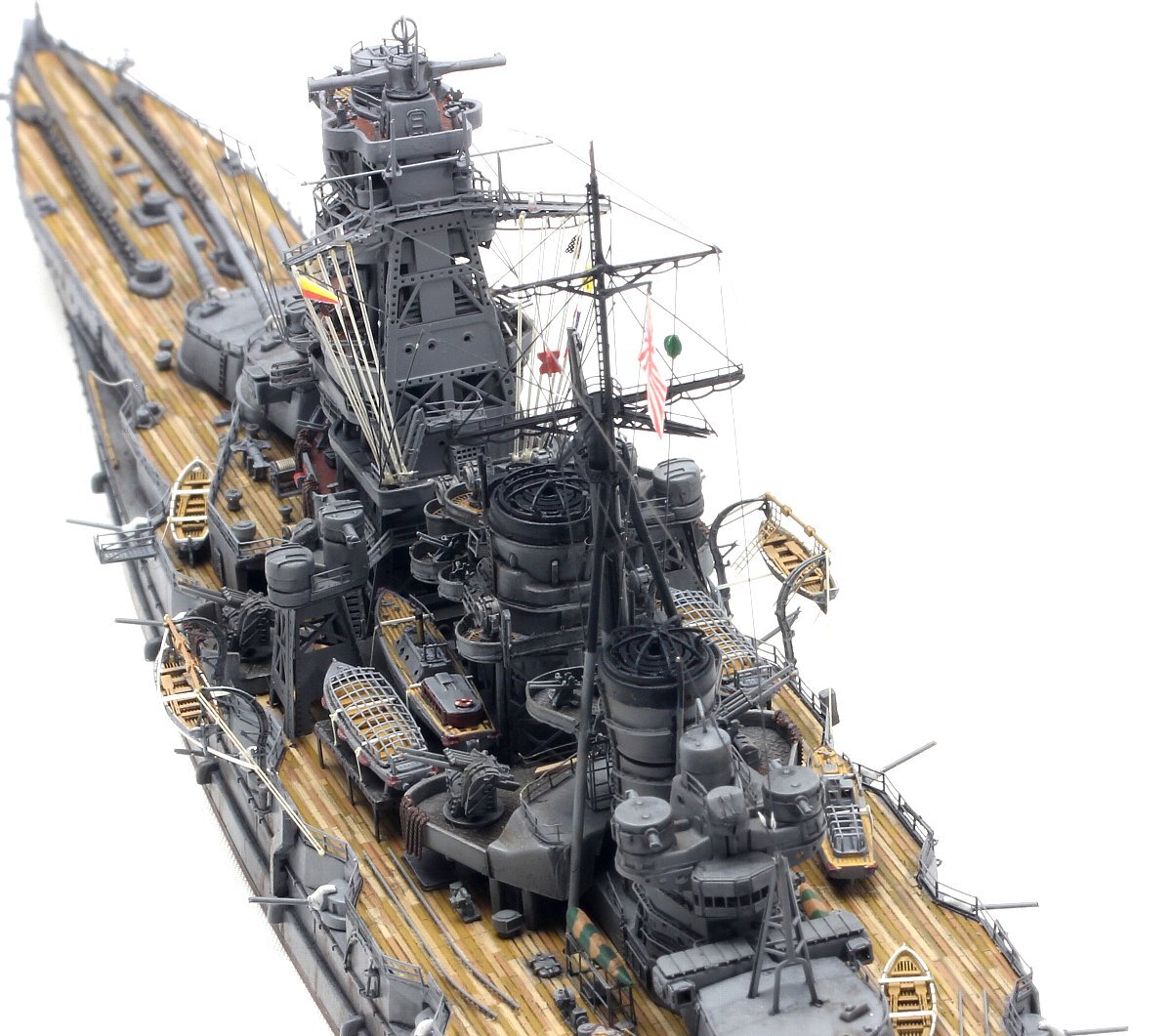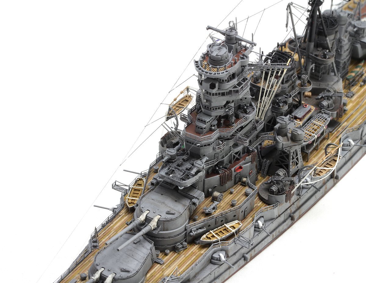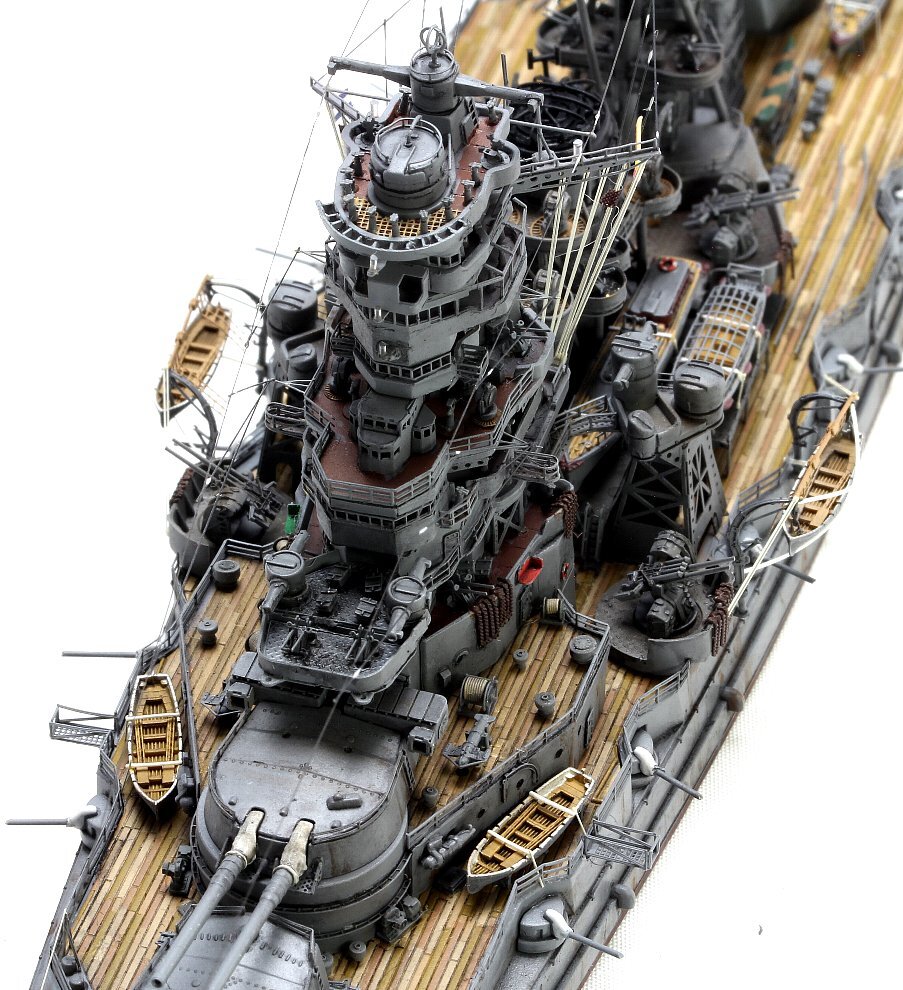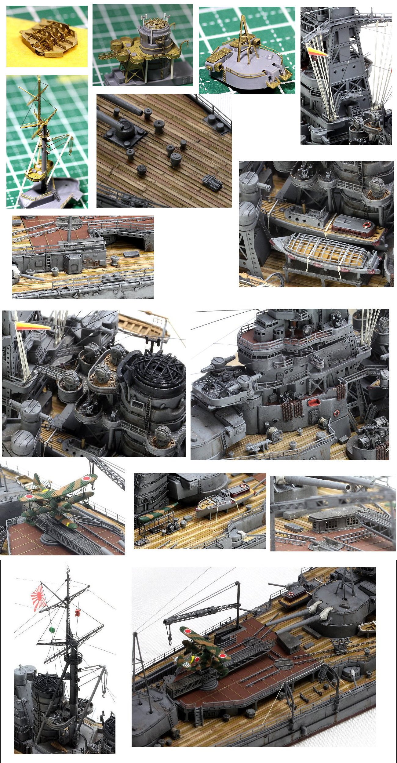 カッターボート、内火艇、12m内火ランチ、ウインチ、ペラベーン、荒天排気筒、探照灯、ライト、リール、機銃箱、望遠鏡は 3Dプリンタ製作によるパーツに変更。