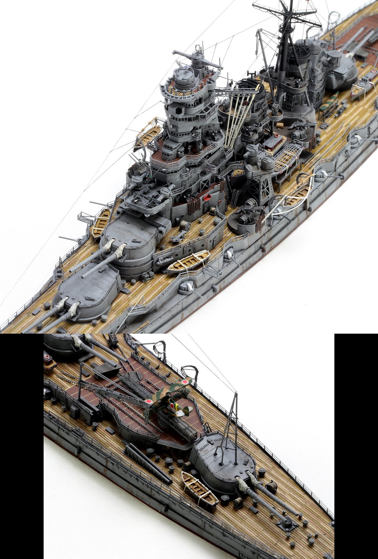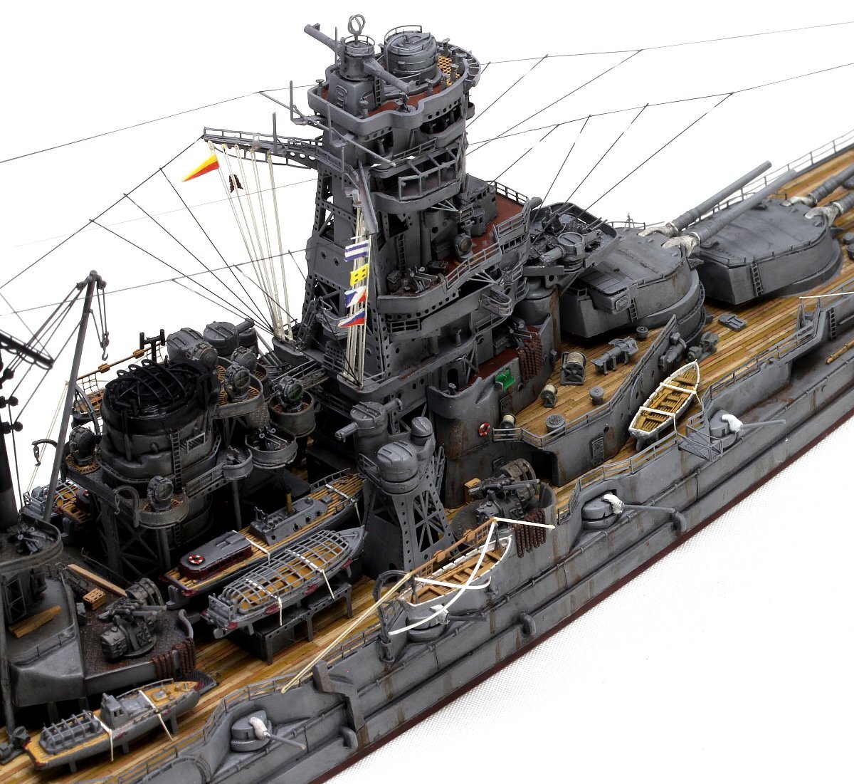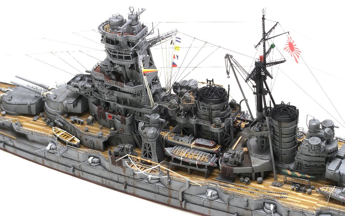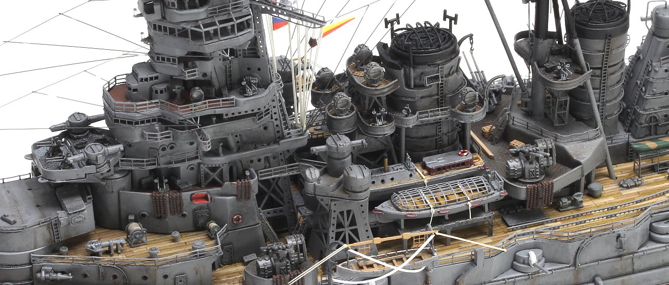 カッターボート、内火艇、12m内火ランチ、ウインチ、ペラベーン、荒天排気筒、探照灯、ライト、リール、機銃箱、望遠鏡は 3Dプリンタ製作によるパーツに変更。