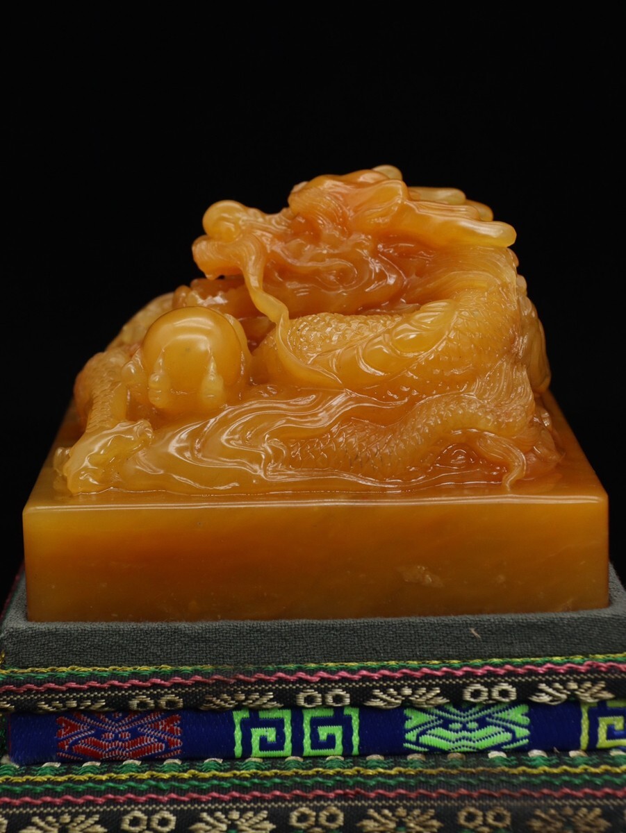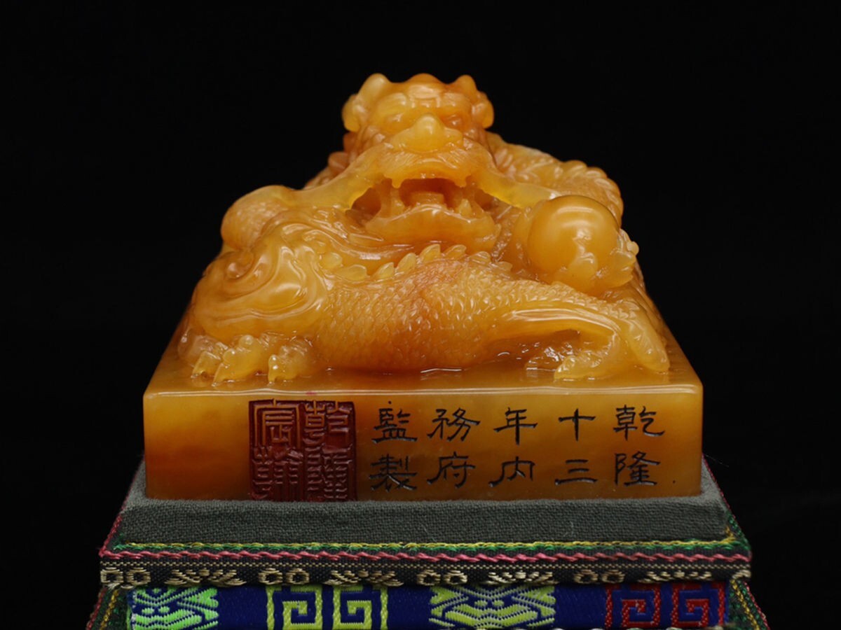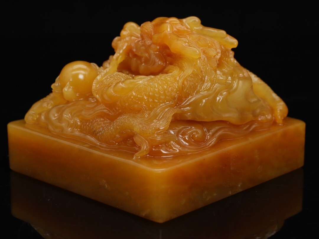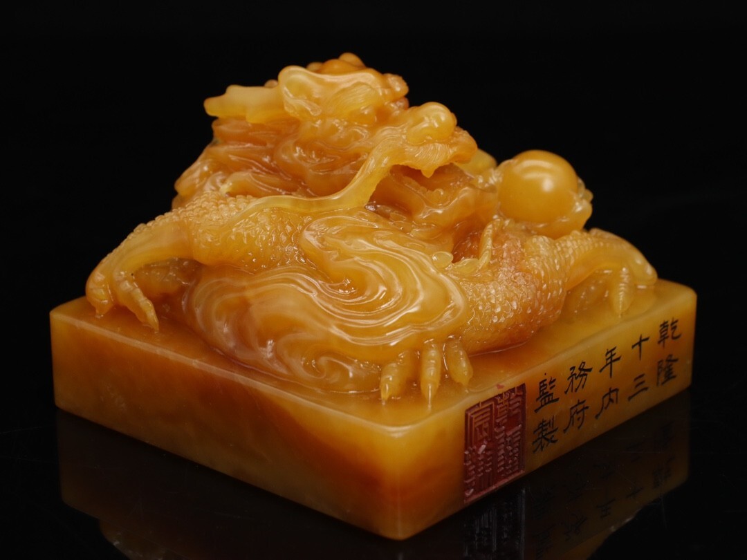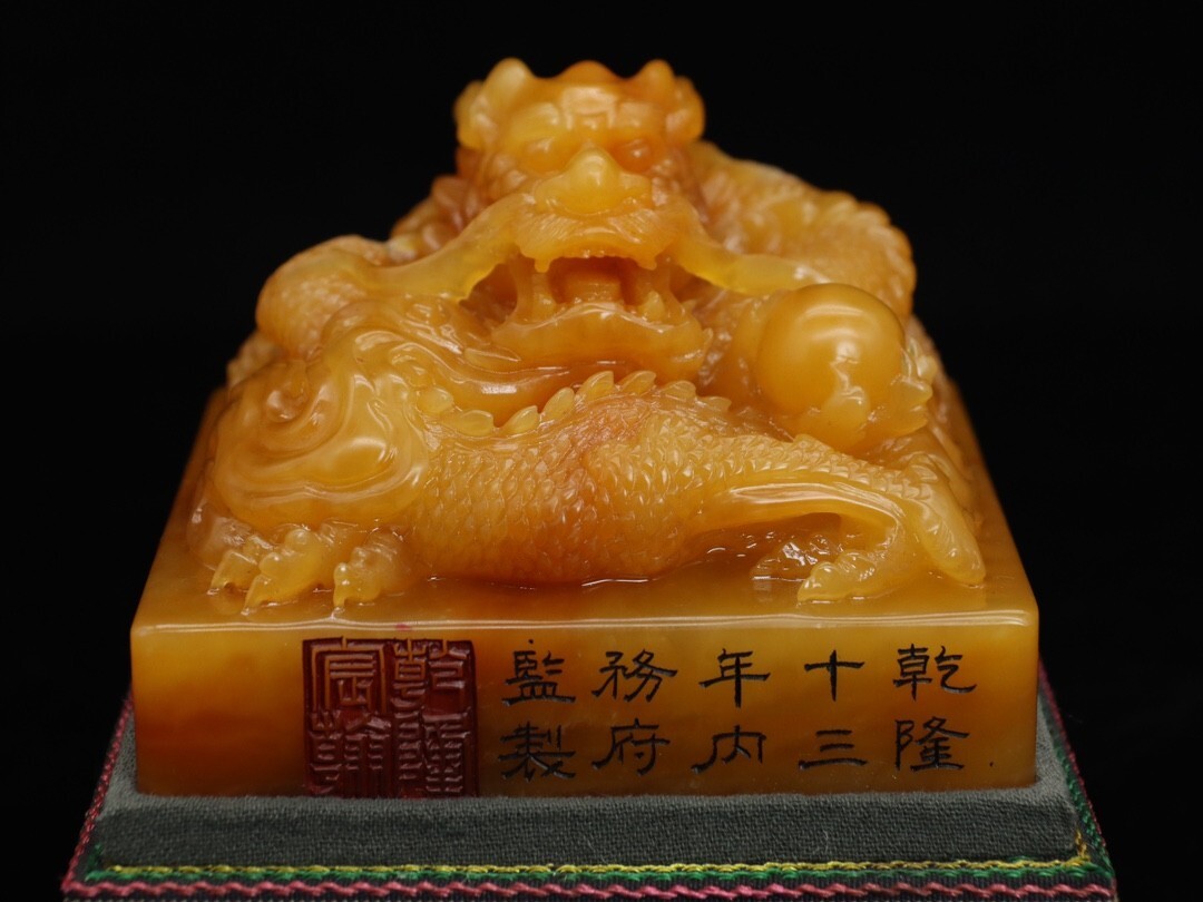 「清 乾隆十三年内務府監製 老寿山石 田黄石彫り 龍戲珠印章」極細工 擺件 古賞物 中国古美術 旧蔵出