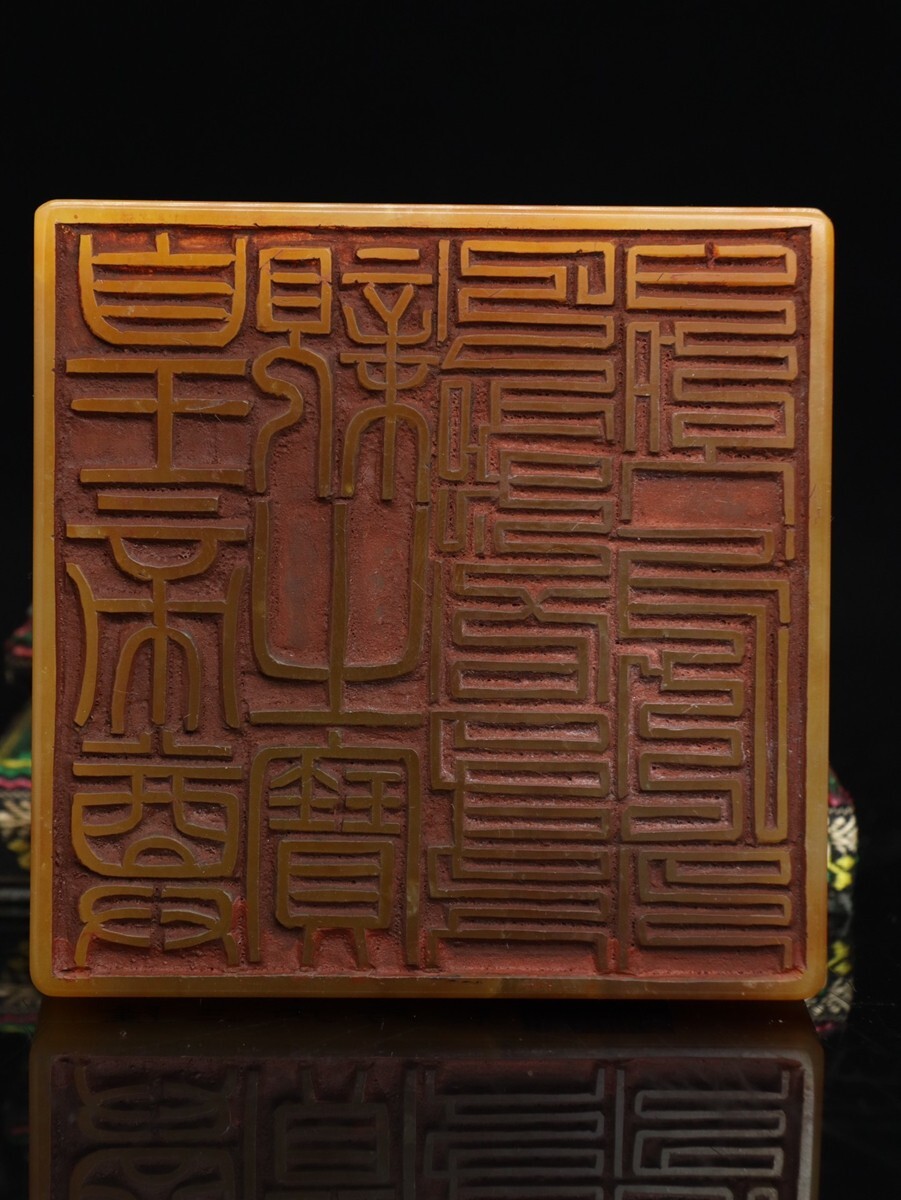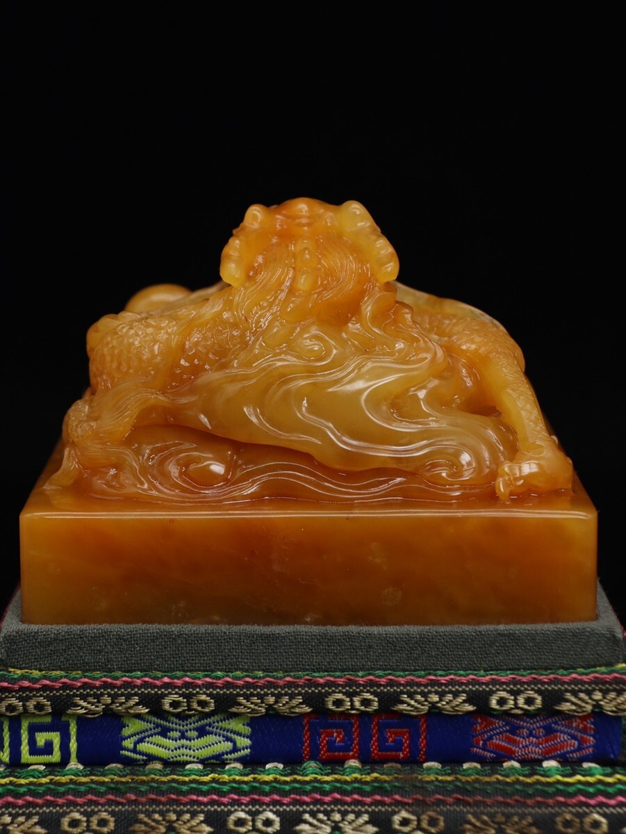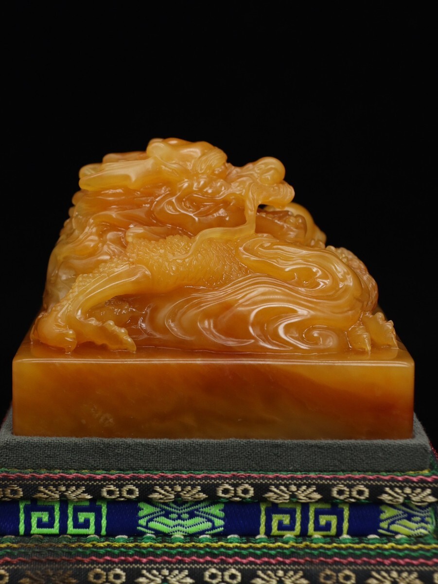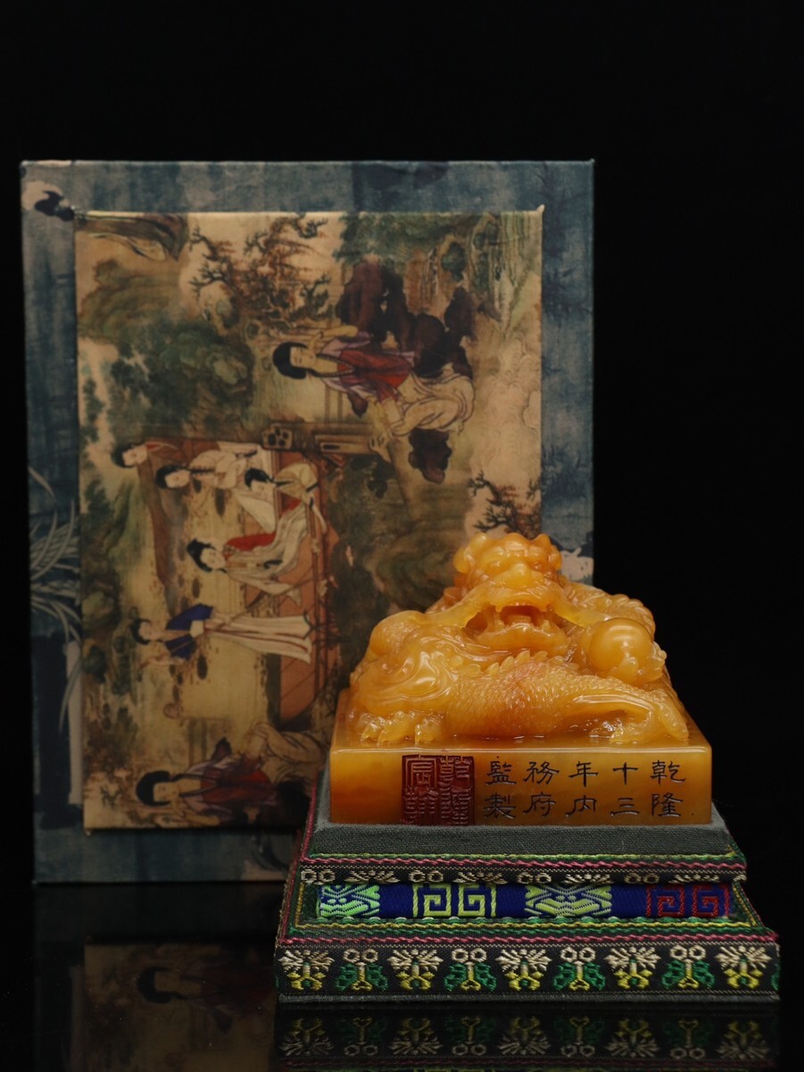 「清 乾隆十三年内務府監製 老寿山石 田黄石彫り 龍戲珠印章」極細工 擺件 古賞物 中国古美術 旧蔵出