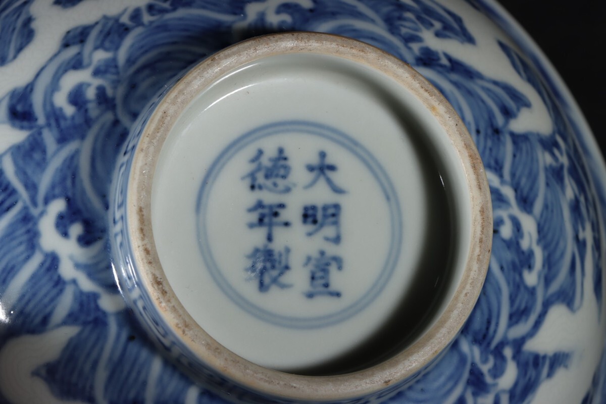 「明 宣徳年製 陶磁器 青花留白海水龍紋 碗」染付 置物 擺件 古賞物 中国古美術 旧蔵出