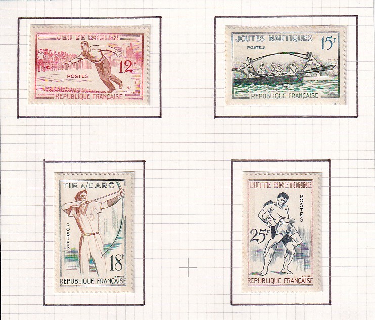 150 フランス【未使用】<「1958 民族スポーツ」 4種完 on リーフ切取り >