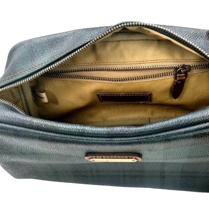 皮の持ち手付きで、中にファスナー開閉のポケットが一つあります。