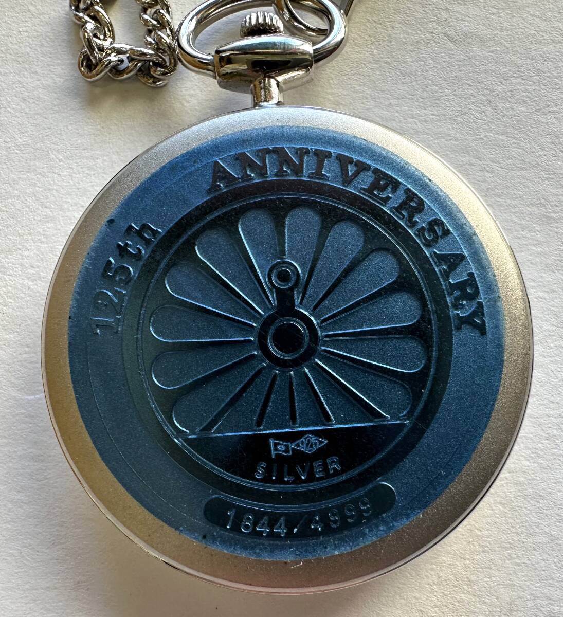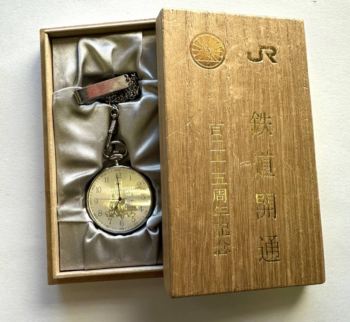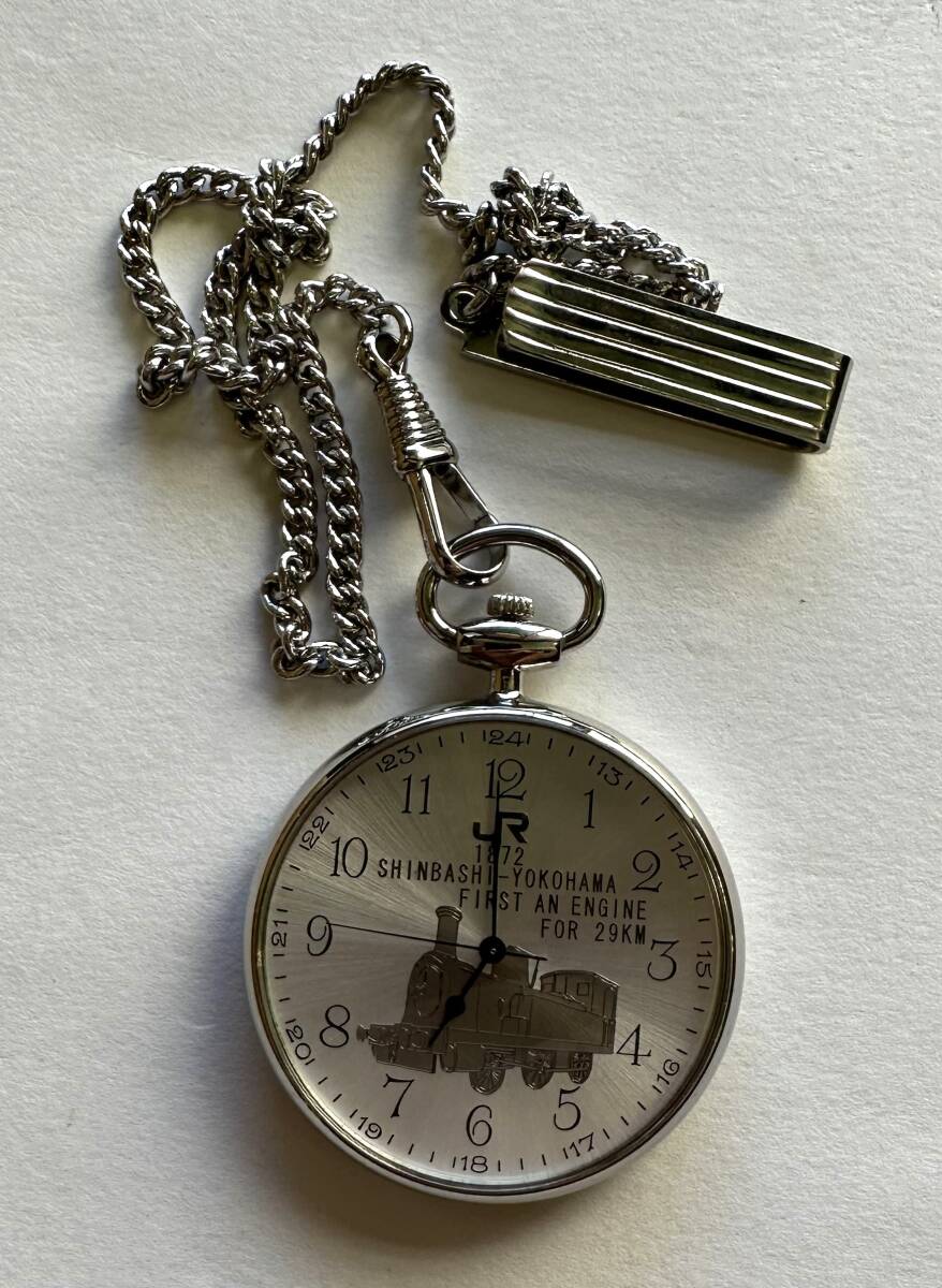 1円~【未使用/希少品】JR鉄道開通 125周年記念 懐中時計 シルバー sv925 ラウンド 銀文字盤 チェーン付き quartz クオーツ 箱付 1844/4999