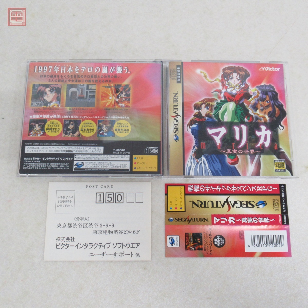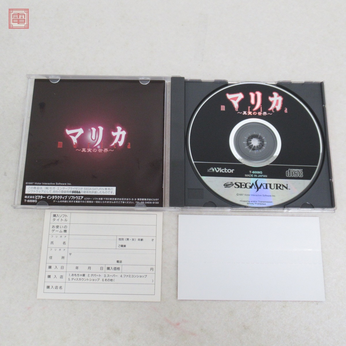 動作保証品 SS セガサターン マリカ 真実の世界 Marica ビクター Victor 箱説帯ハガキ付 こちらの商品は動作保証品となりますので、一週間の動作保証をお付けします。 ■ケースにスレ、キズがあります。 ■取扱説明書にスレがあります。 ■盤面に目立ったキズはありません。 ■写真のものが全てです。付属物の有無や状態については写真からご判断ください。 ■チェックに使用したモニターやチェック機器等は、特に表記がない限りは付属いたしません。 ■商品到着後、当店の保証期間中は、商品及び箱や取説、付属品などを1つでも廃棄や破損をしないようにお願い致します。廃棄や破損をした場合、商品に問題があった場合でも対応や返金などの対処ができなくなります。 | |||