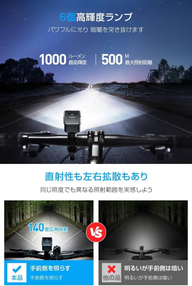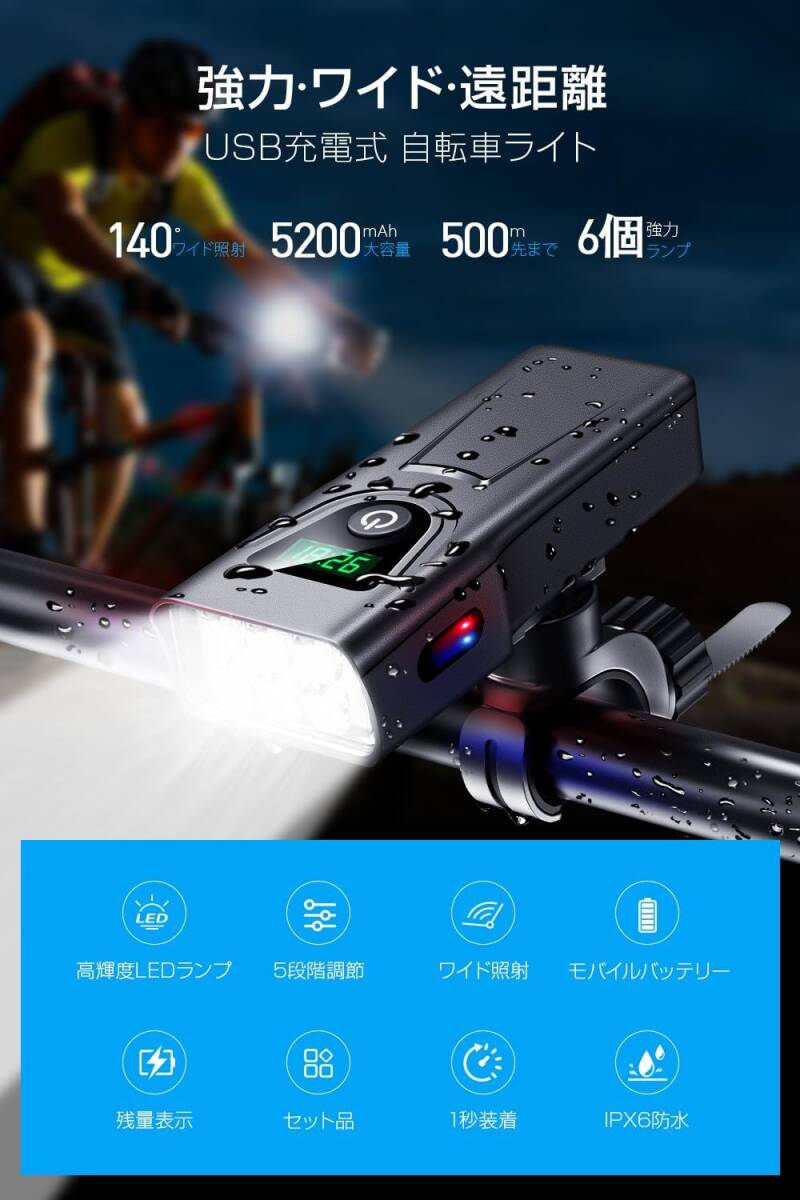 自転車 ライト 充電式 大容量 5200mAh 6個強力ランプ サイド視認灯搭載 自転車ヘッドライト 1000ルーメン 高輝度 5つ調光モード IPX6防水