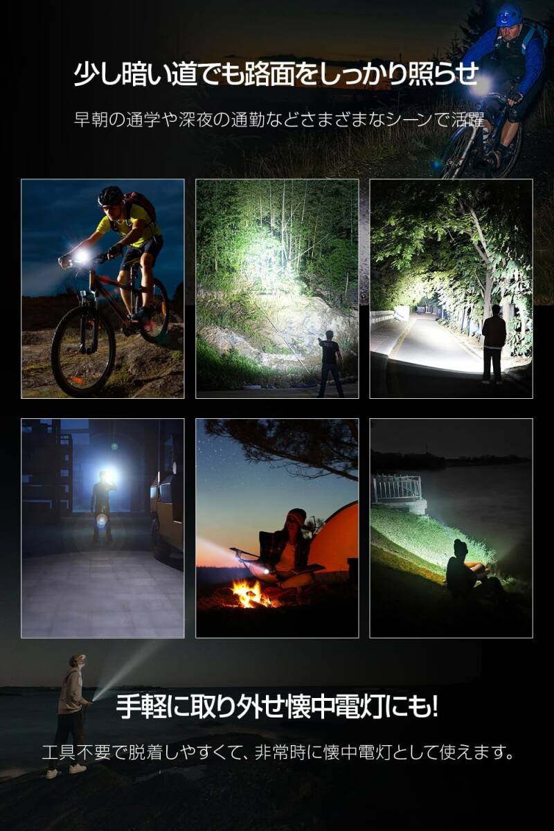 • 【利用可能時間表示 リアライト付き】自転車ヘッドライトの電池残量は、残りの使用可能時間が表示されます。輝度モードによって使用時間は異なるので、パッと見ればあとどれぐらい使えるかが一目瞭然、充電のタイミングも把握できます。さらに、リアライトも備えており、前方だけでなく、背後の安全にも配慮されています。自転車用のほかにも、キャンプ、ハイキング、登山、夜釣り、夜の散歩、停電時、非常時など、様々な場面に懐中電灯兼用に活用できます。