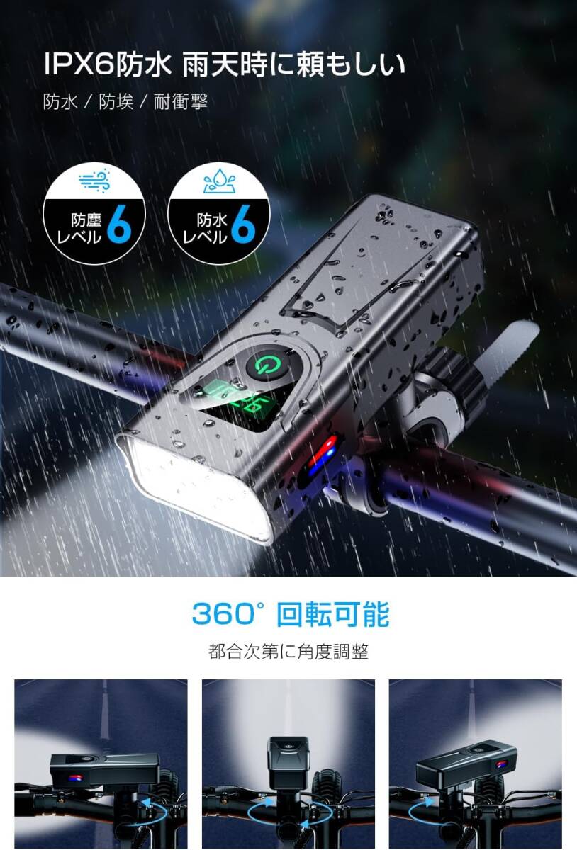 • 【高強度&防水仕様 取り付け簡単】IPX6防水規格により、雨などの水を有効的にブロックし、突然の雨や嵐などの悪天候にも対応できます。防水カバー付きで充電部を効果的に保護します。高度ABS+PC素材を採用して、軽量を実現しながら衝撃に強く、耐摩耗性や耐腐食性に優れています。工具はいらず、車種を限らず自転車に取り付けることができ、脱着にも便利です。360°回転ブラケットで、都合次第に照射角度を調整して異なる視線を提供してくれます。