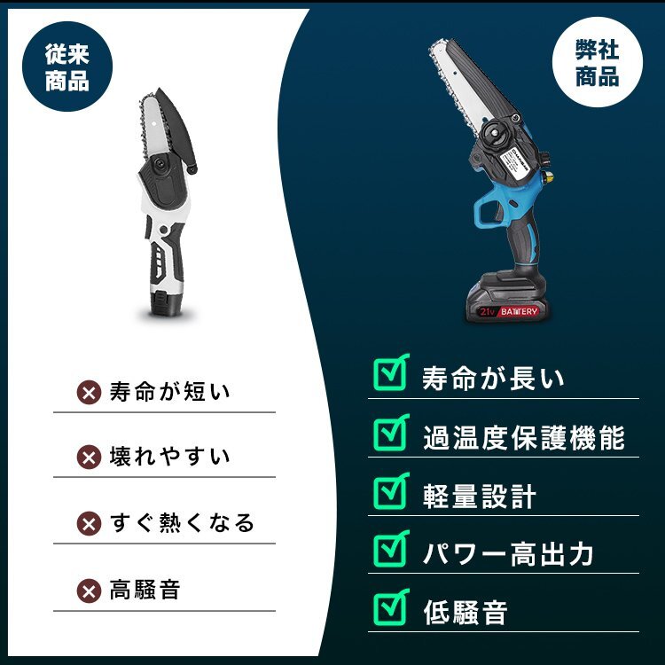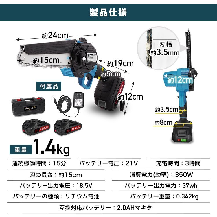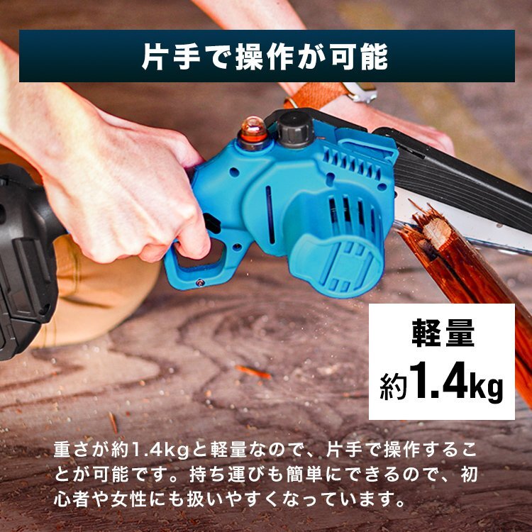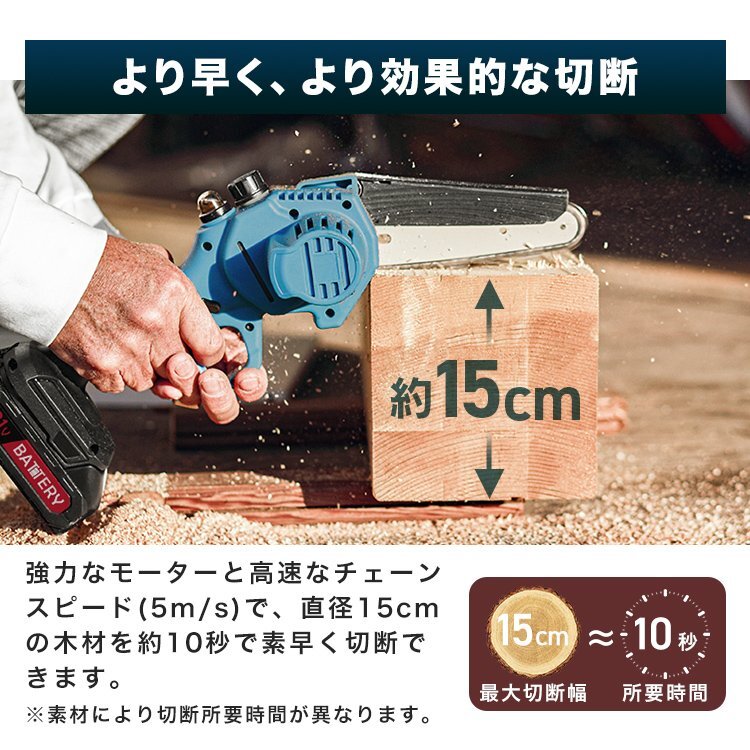 初心者や女性でも使いやすい軽量タイプです。 強力なモーターと高速なチェーンスピードで素早く切断できます。 チェーンカバーやロック解除ボタン、事故を防ぐ安全機能が搭載されているので安心してご使用いただけます。 給油機能を搭載し、チェーンに注油して切断速度を上げ、チェーンの寿命を延ばせます。 \こんな時に大活躍します/ ・庭木の手入れや枝の切り取り ・キャンプやアウトドアでの薪調達 ・DIYプロジェクトや木工作業 ・緊急時の使用や災害対応 【商品詳細】 サイズ:(約)縦38×横12cm 刃の長さ:(約)15cm 重量:(約)1.4kg 【セット内容】 本体、充電コード、収納ボックス、バッテリー×2 商品コード:AA07F |