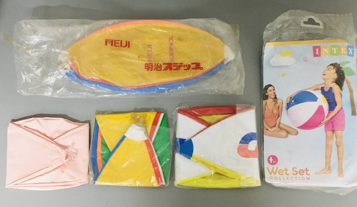 ●明治ステップ ビーチボール中古品(6色無地、サイズは空気を抜いた状態で、空気栓から反対側の端まで30㎝)