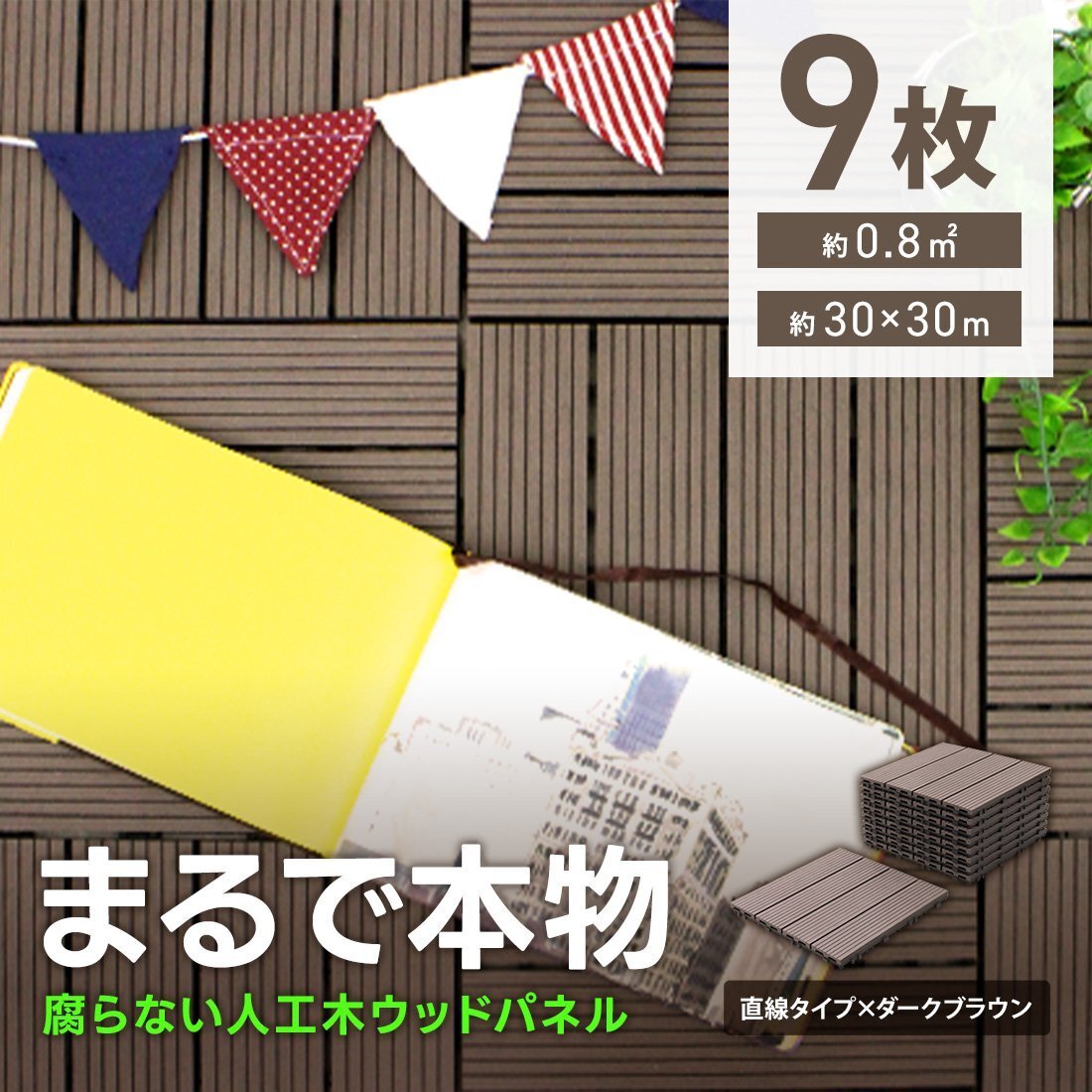 | パズルみたいにサイドの凹凸を繋ぎ合わせるだけで簡単に施工が出来るジョイント式ウッドタイル! ベランダの雰囲気を変えたり劣化してきたベランダの修復に最適! 雨や日差しによる劣化に強く耐腐食性もある人工木を使用。 55%の天然木粉と45%の樹脂で出来ており、天然木製と比べると定期的なお手入れも不要! 小さなお子様やペットにも安心。さらっとした感触でささくれや釘による怪我の心配もなし。 安全に長期間使用できる優れものです! 【商品詳細】 カラー:ダークブラウン(直線タイプ) 表面のサイズ(約):幅29.5cm×長さ29.5cm×高さ2cm ジョイント部分も含んだサイズ(約):幅30.5cm×長さ30.5cm×高さ2cm 表面隙間:5mm 重量(約):0.9kg 圧力強度:3000N 材質:WPC素材(木材・プラスチック複合材) 表面・・・人工木(天然木の木粉55%入り) 裏面・・・ポリプロピレン樹脂 【商品内容】 ウッドパネル × 9 |