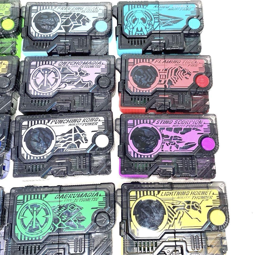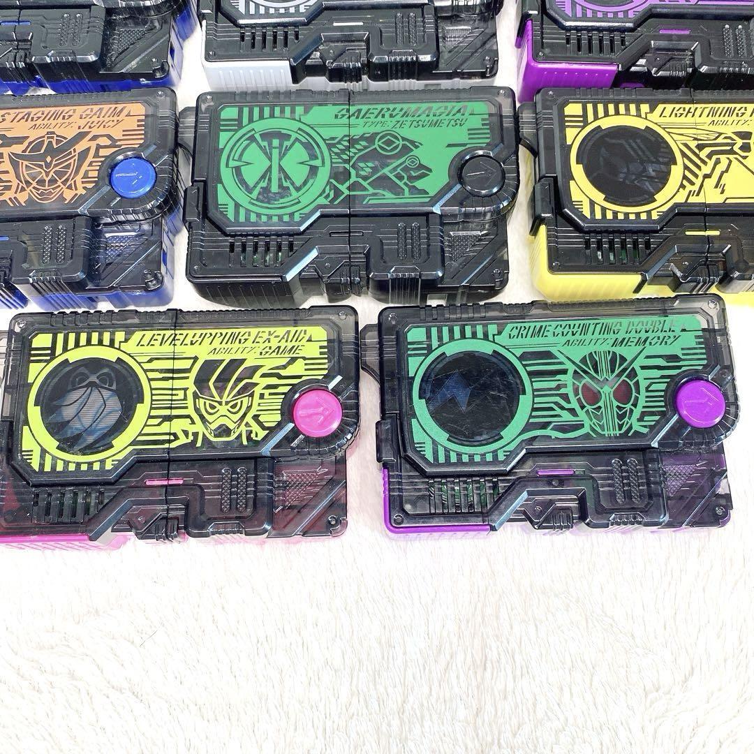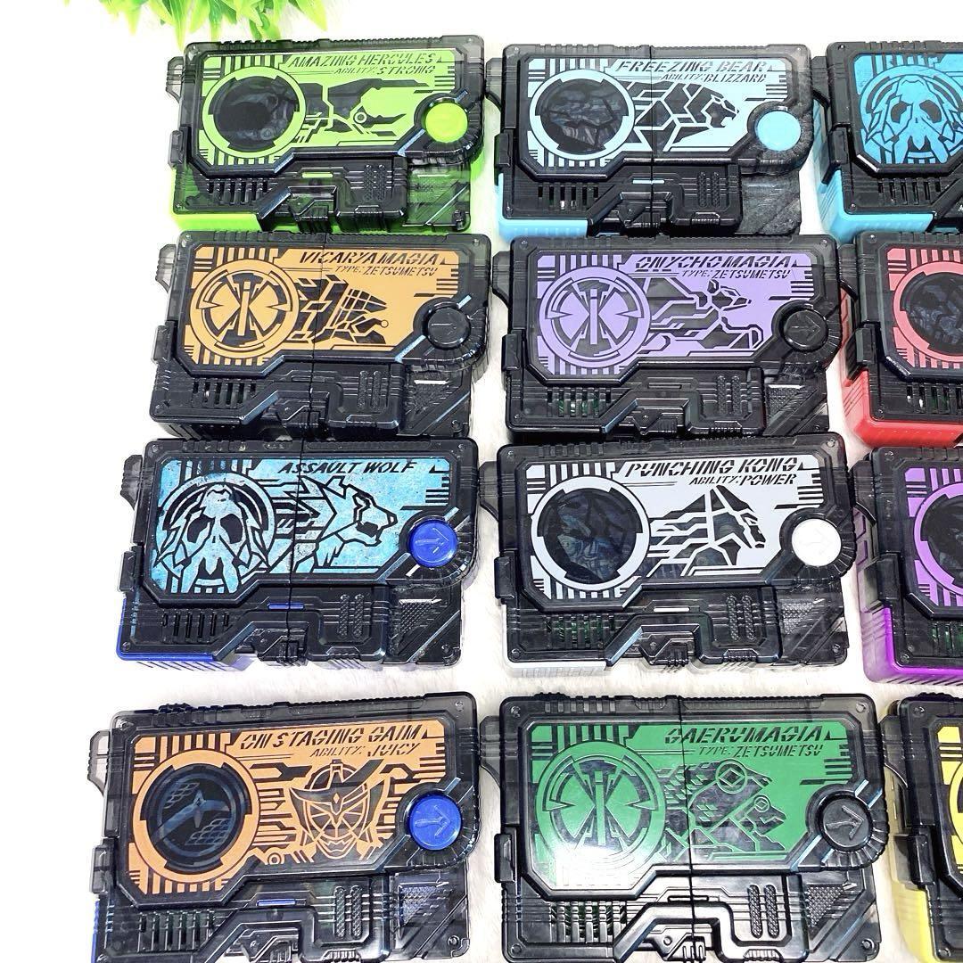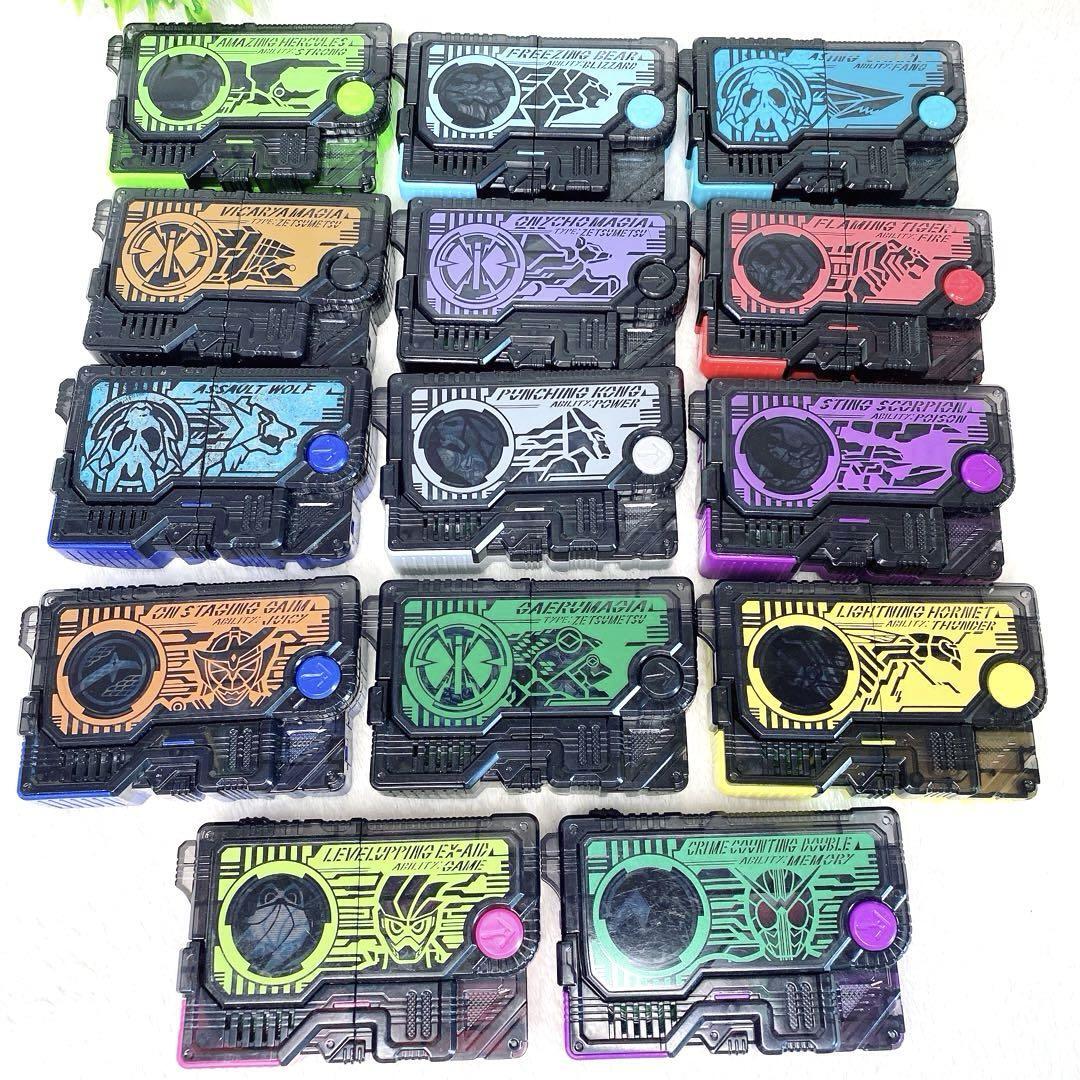 多彩な色の仮面ライダーのキャラクター玩具、全14個セット。