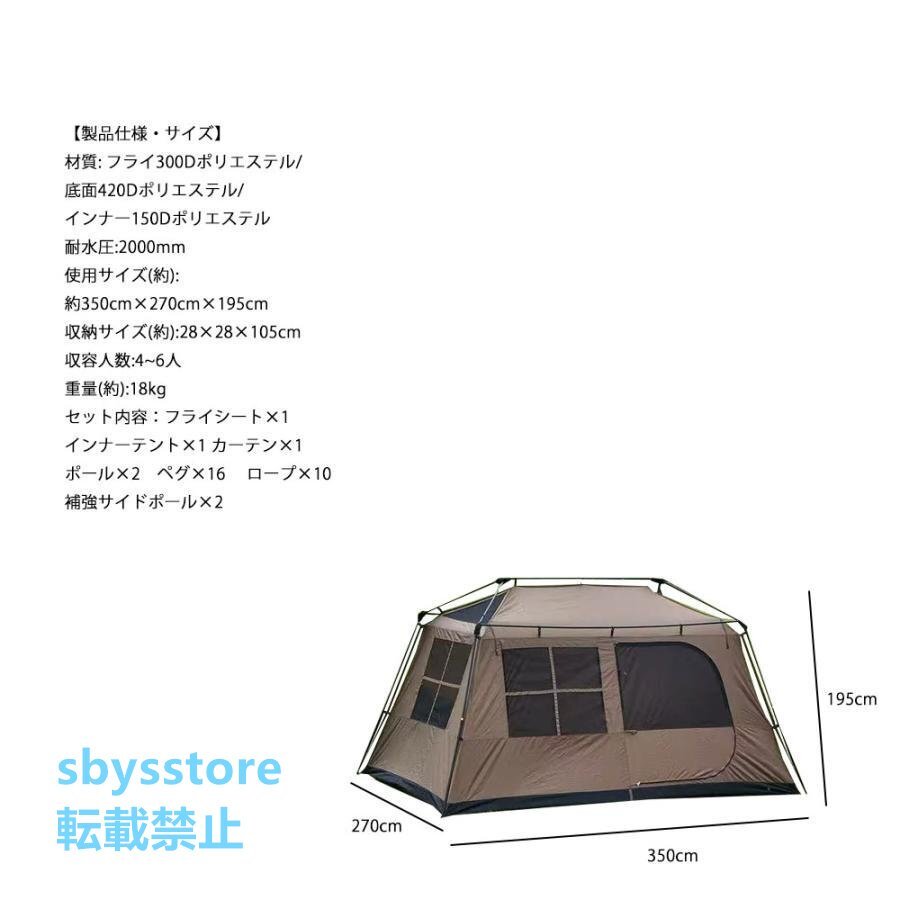 大型ワンタッチテントで設営時サイズは(約395cm×270cm×183cm(H)、広く高くて、収容人数4~6、収納時約30×25×110cmに抑えられます。