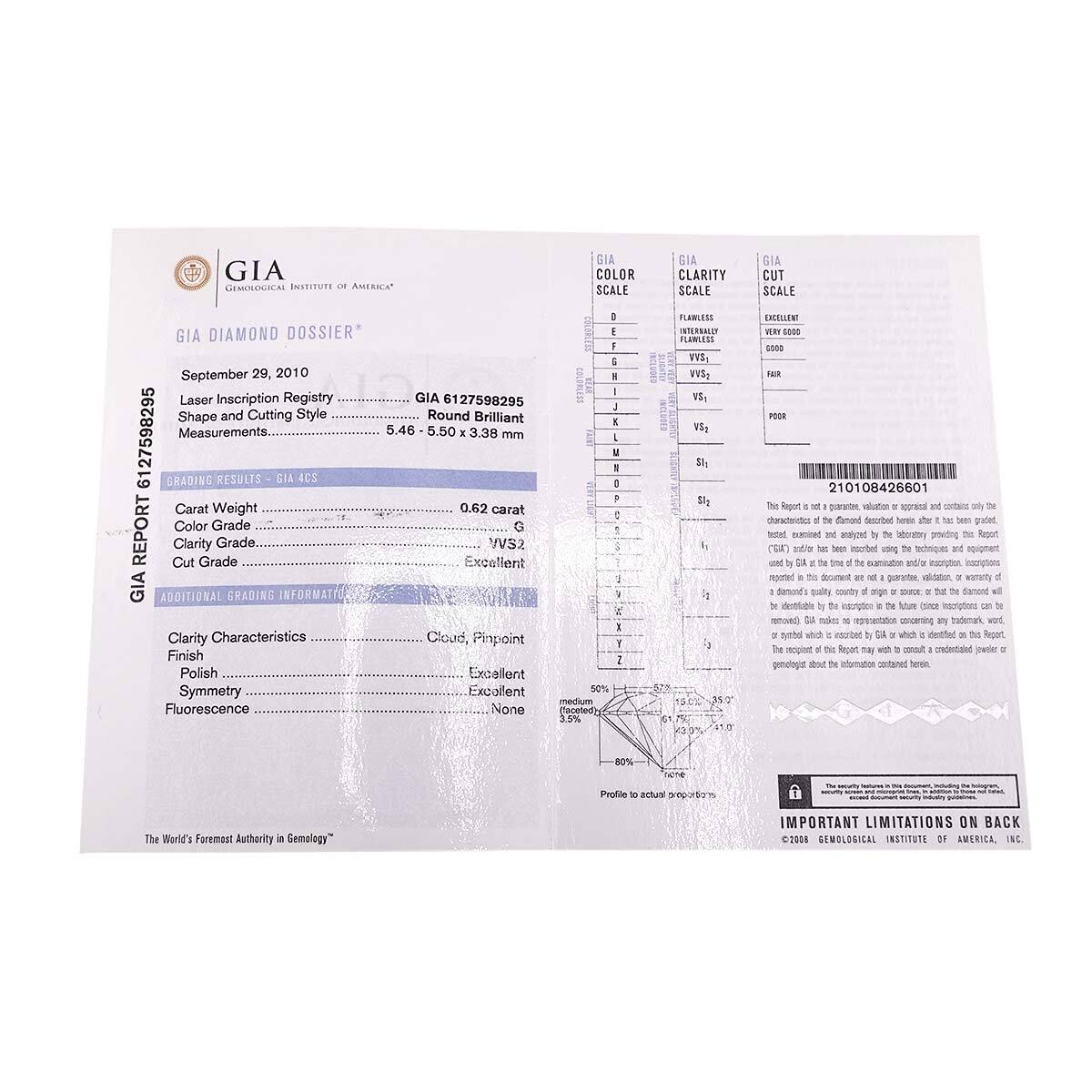 材質/刻印 | プラチナ ダイヤ 0.62ct(G/VVS2/3EX) (刻印Pt950、0.62) |