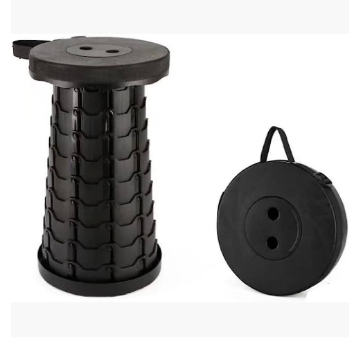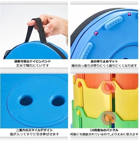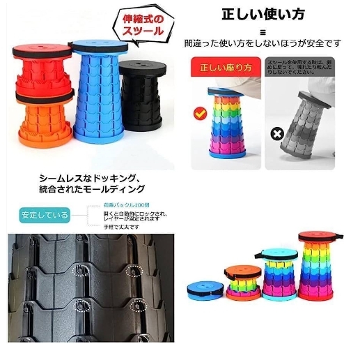 使い方超簡単:指をスツール両辺の穴に挿して、ひねりながら伸ばして、好きな高度に引いて回転して固定します。逆方法に少しひねりを入れながらスツールの両端を押すだけで一瞬で収納可能です。ショルダータイプに持ち運ぶ時は、チェアの側に回るロップがあるので肩にかけ持ち運べるから本当に便利です。