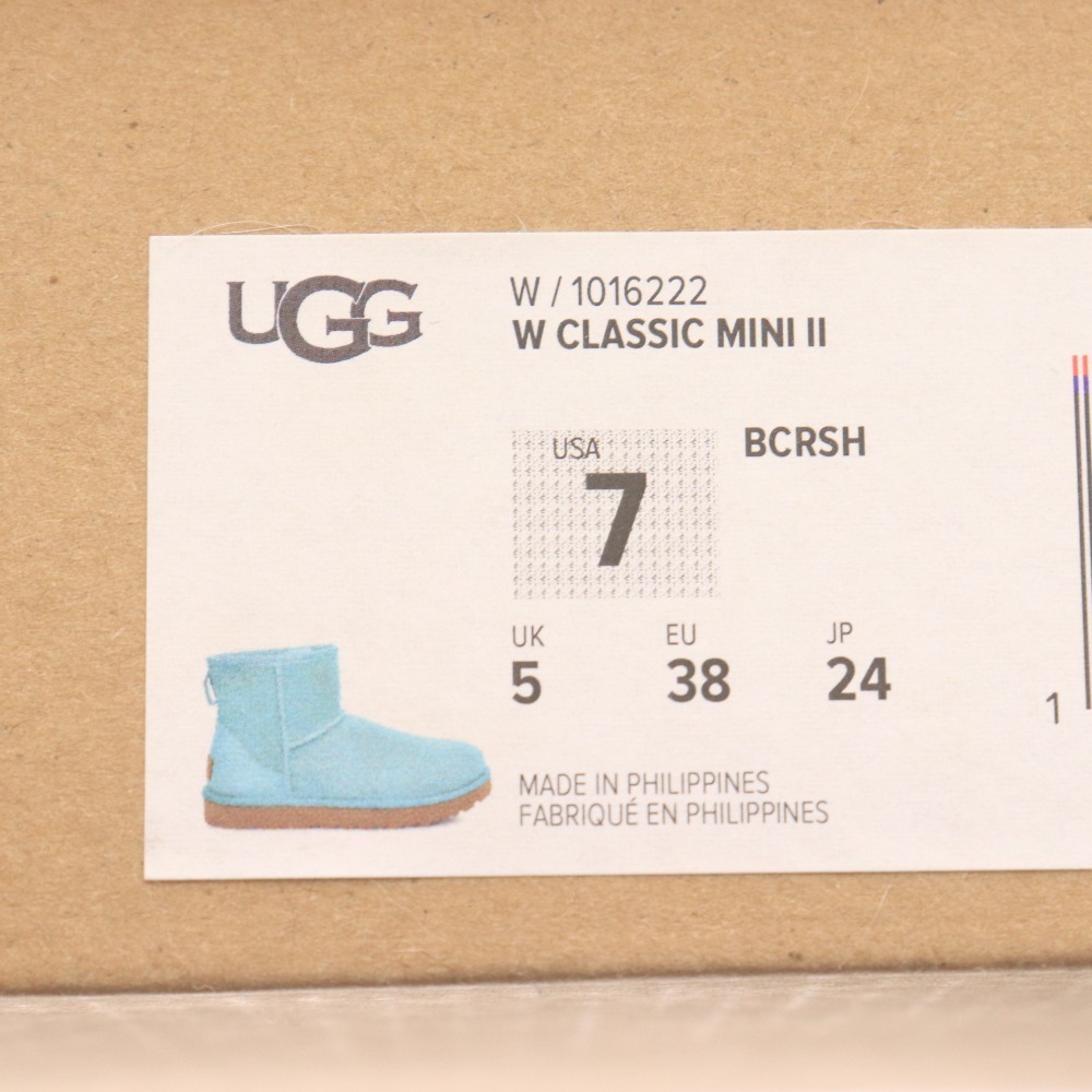 UGG アグ ムートンブーツ クラシックミニ 1016222 靴 シープスキン BCRSH レディース 7(24cm相当) ブルーグリーン 箱付き 未使用 未使用品とのことで、お伺いしております。 付属品:写真のものが全てです ●表記サイズ:7 アウトソール:27cm くつ幅:10.5cm 口周り(内周):27cm ブーツ全長 (ヒール含む):15cm ヒール(かかと高さ):3cm ⇒ アパレル商品のカラー基準・採寸方法・海外サイズ換算表 (参考)トルソー(マネキン)は男女ともMサイズです。 素材:シープスキン | ||||||||||||||||