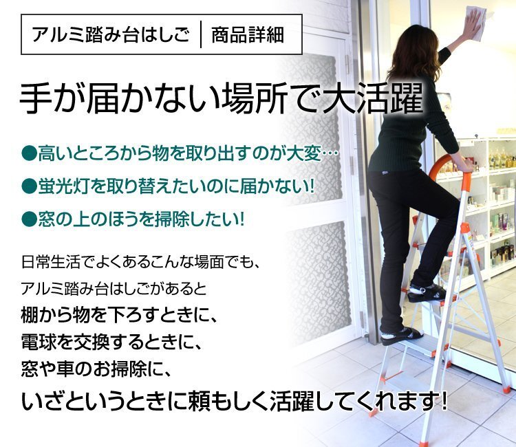 | 一家に一台あると便利! 照明器具の交換や、高い位置になる棚から物を取り出すときに 便利な折りたたみステップ台です。 持ち手がついて安心!最上段まで上れますよ♪ アルミ製なのでとっても軽い!女性でも余裕で持てる! サッと持ち運べて移動もラクラク! 未使用時はコンパクトに折りたたみ、省スペースに収納できます。 ・高い所の窓拭きに ・食器棚の上棚の収納に ・電球や電灯交換に ・撮影スタンド用に ・エアコン掃除に ・車の洗車に ・壁に時計など飾るときに ・愛の告白に(?) などなど いろんなシーンで大活躍です! ぜひ使ってみてください♪ |
