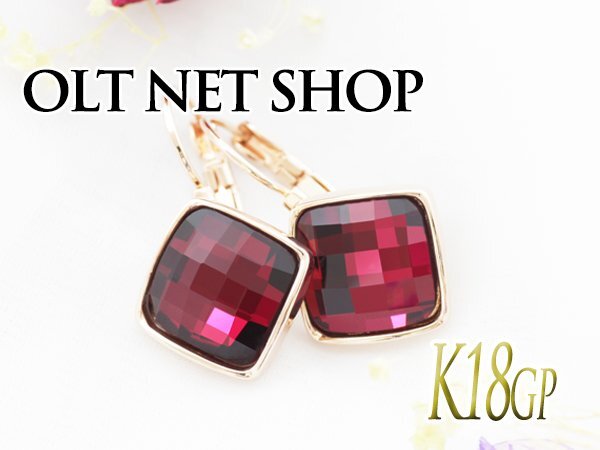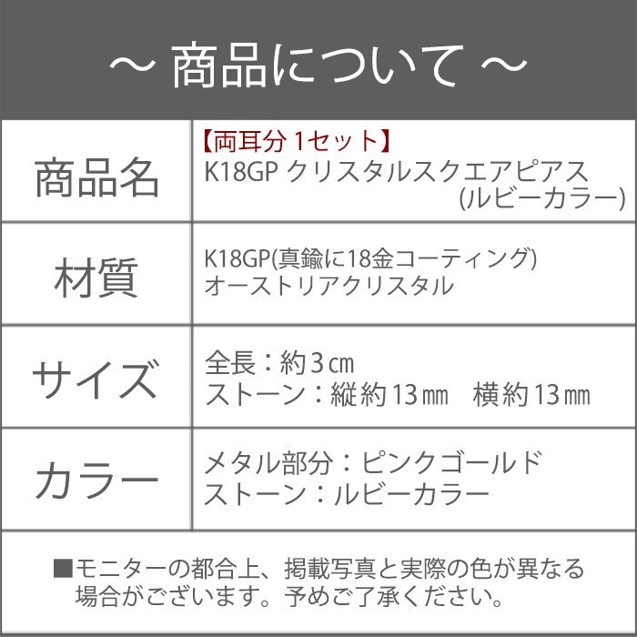 ピアス レディース ルビー カラー クリスタル ピンクゴールド 18金 18kコーティング 四角 大ぶり / K18GP ルビークリスタルスクエアピアス