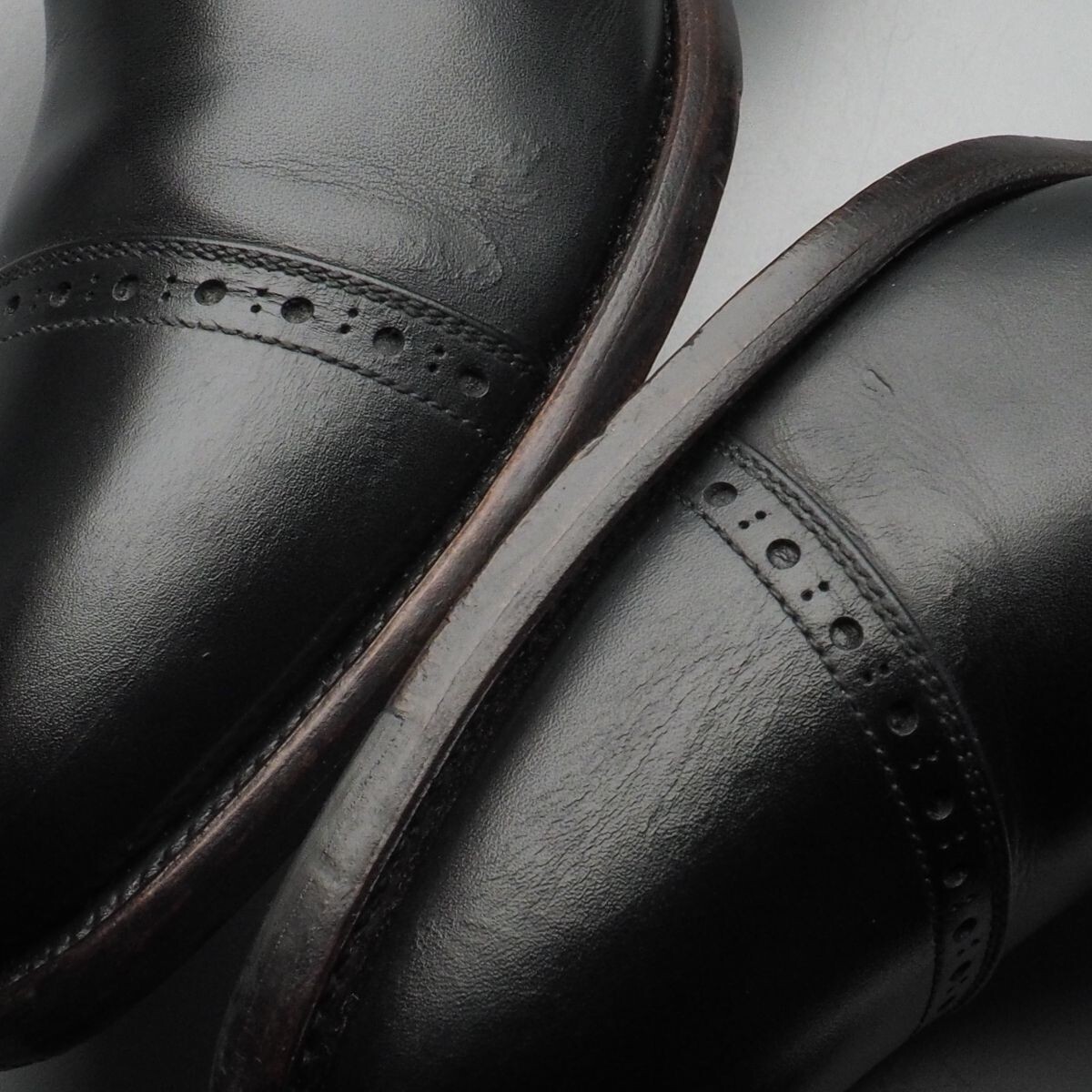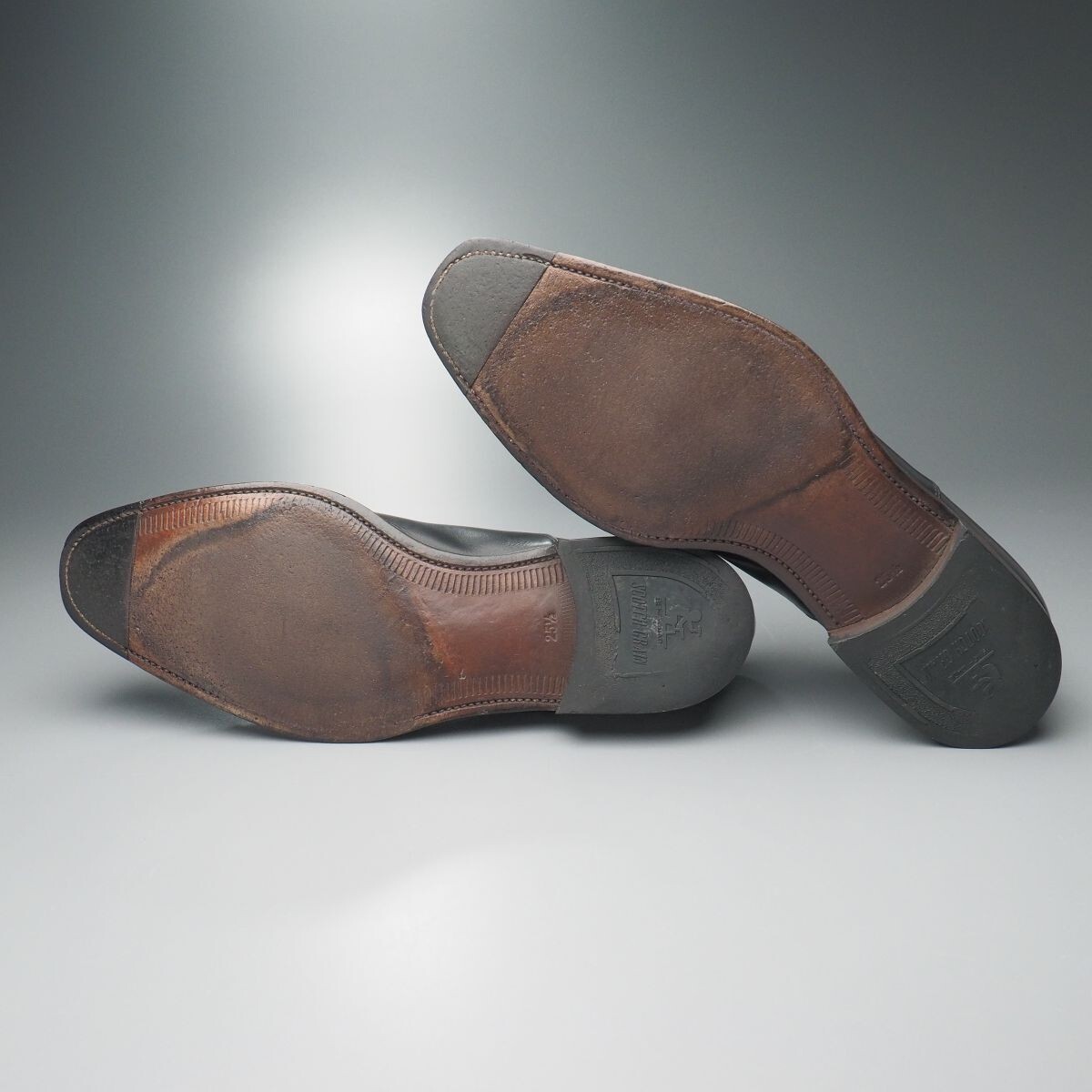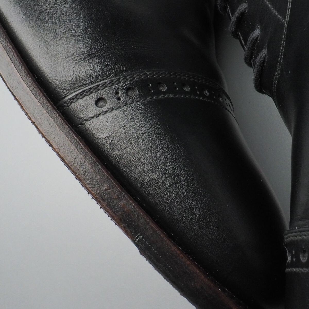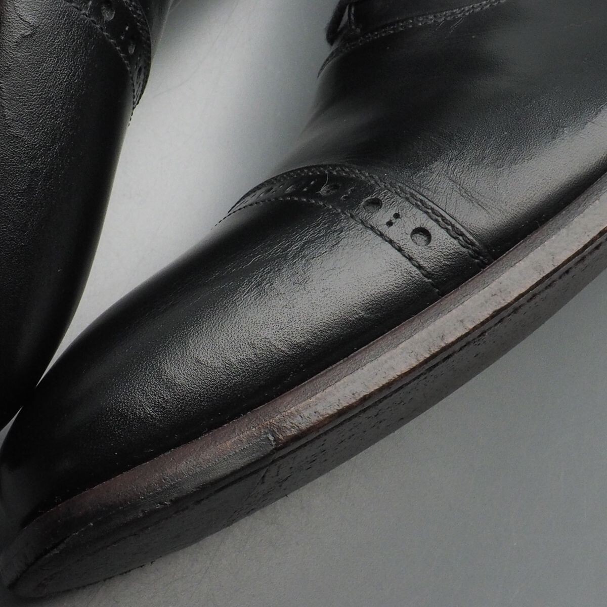 コンディション | 【コンディション詳細】 アッパーのシワ、トゥやかかと周りの薄い擦れキズ、また写真のようにキャップ周りに淡い銀浮き、またインソールやライニングの擦れや汚れが見られますが、その他気になるようなダメージ等なくこれからも気持ちよくご愛用いただけます。 アウトソールの減りはトゥで3mm程度、ヒールで5mm程度です。 | ||