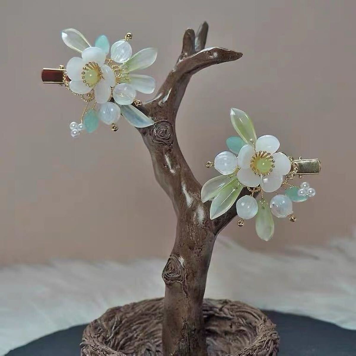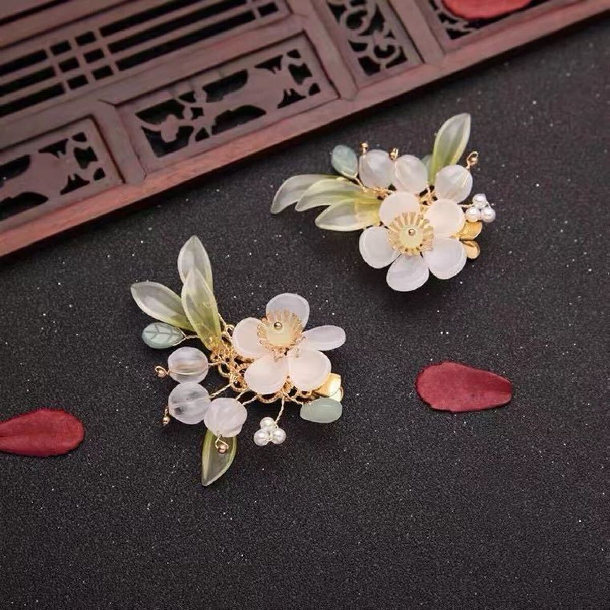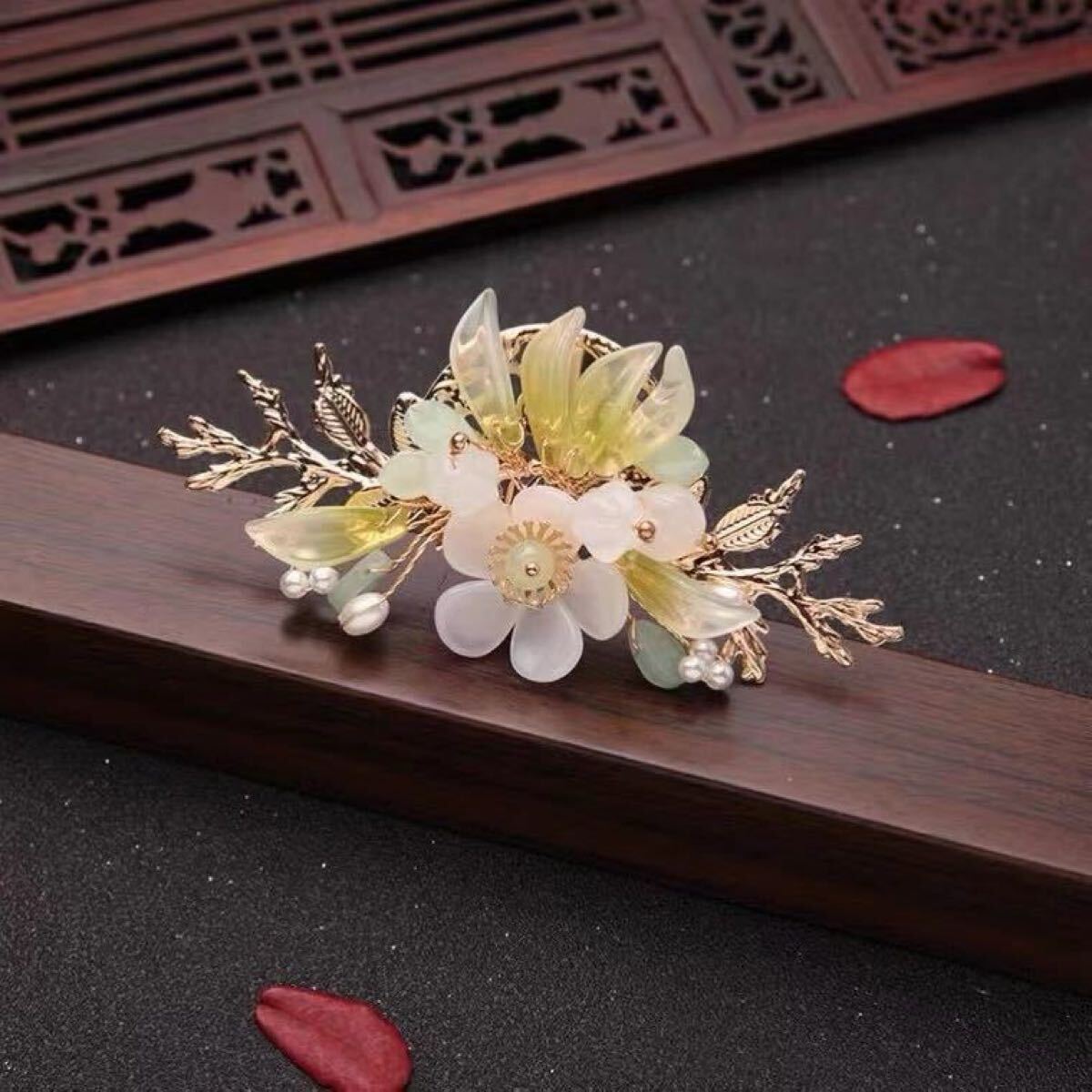 繊細なガラスの花びらと、瑞々しい葉をあしらった華やかな髪飾り。