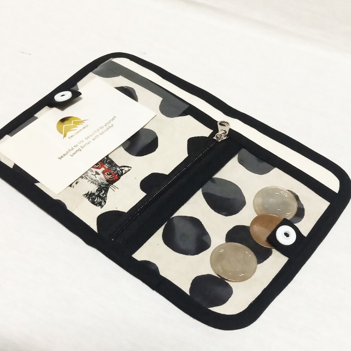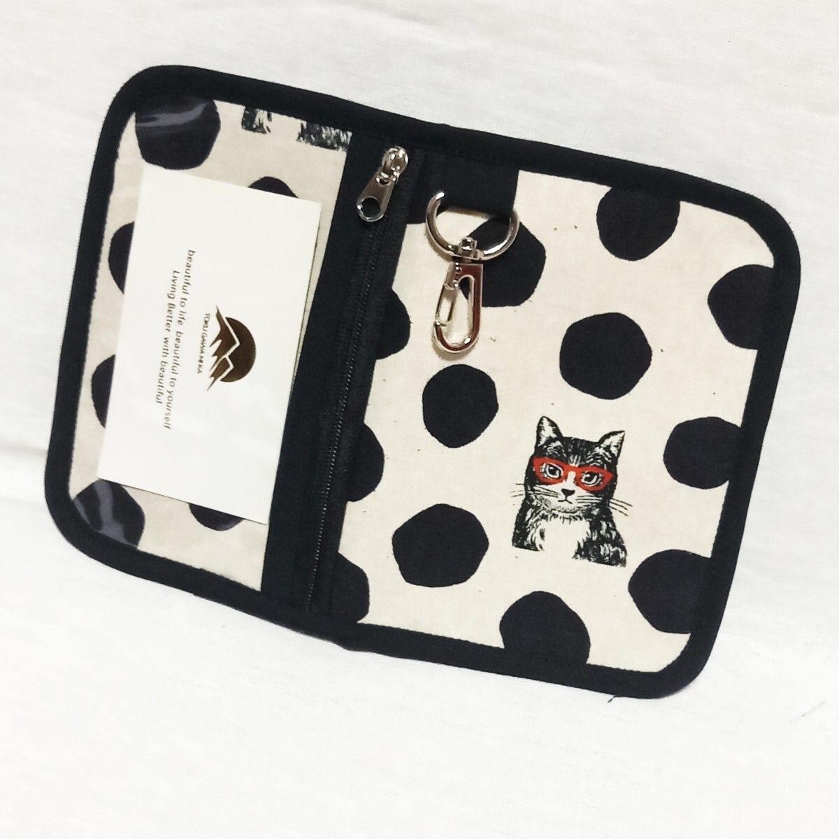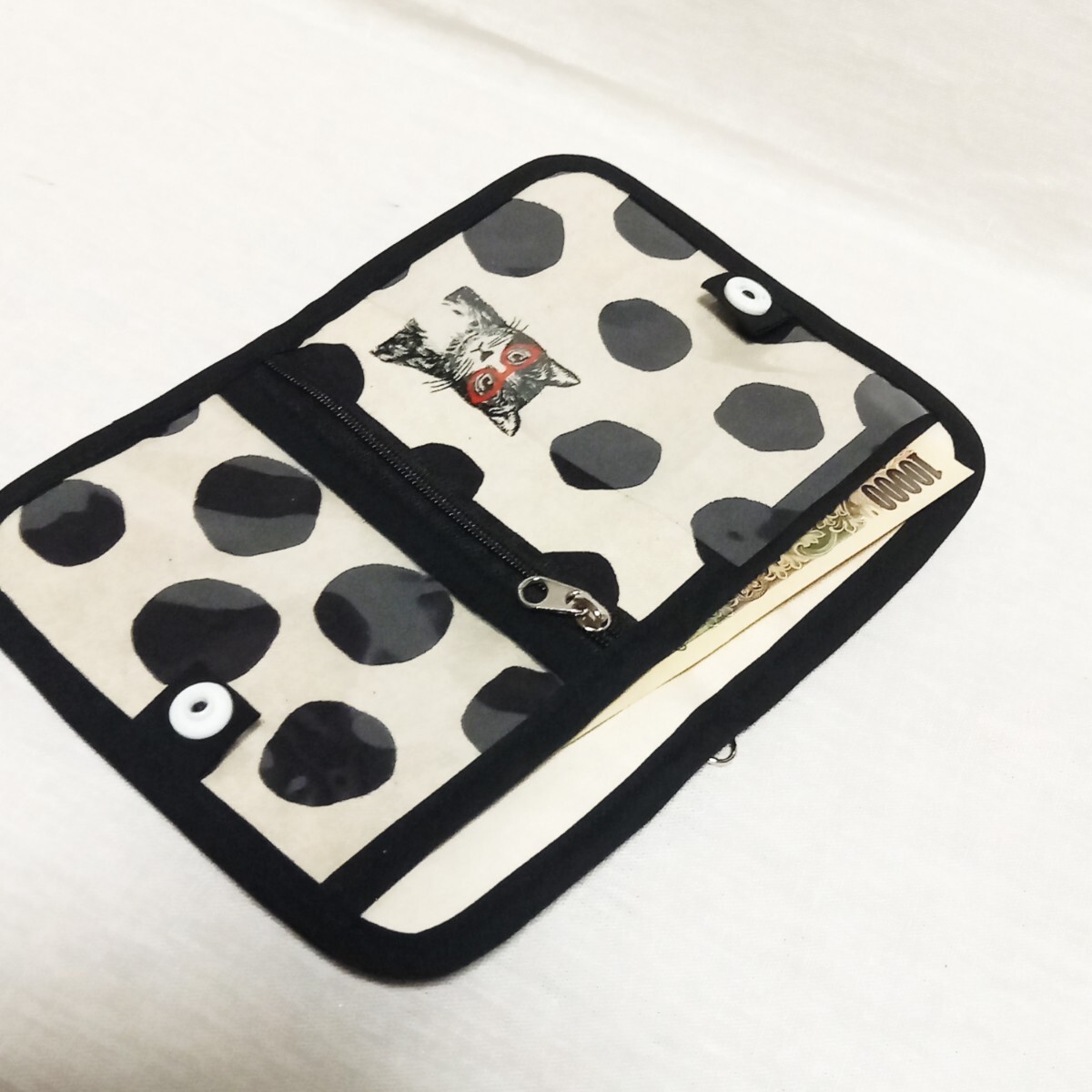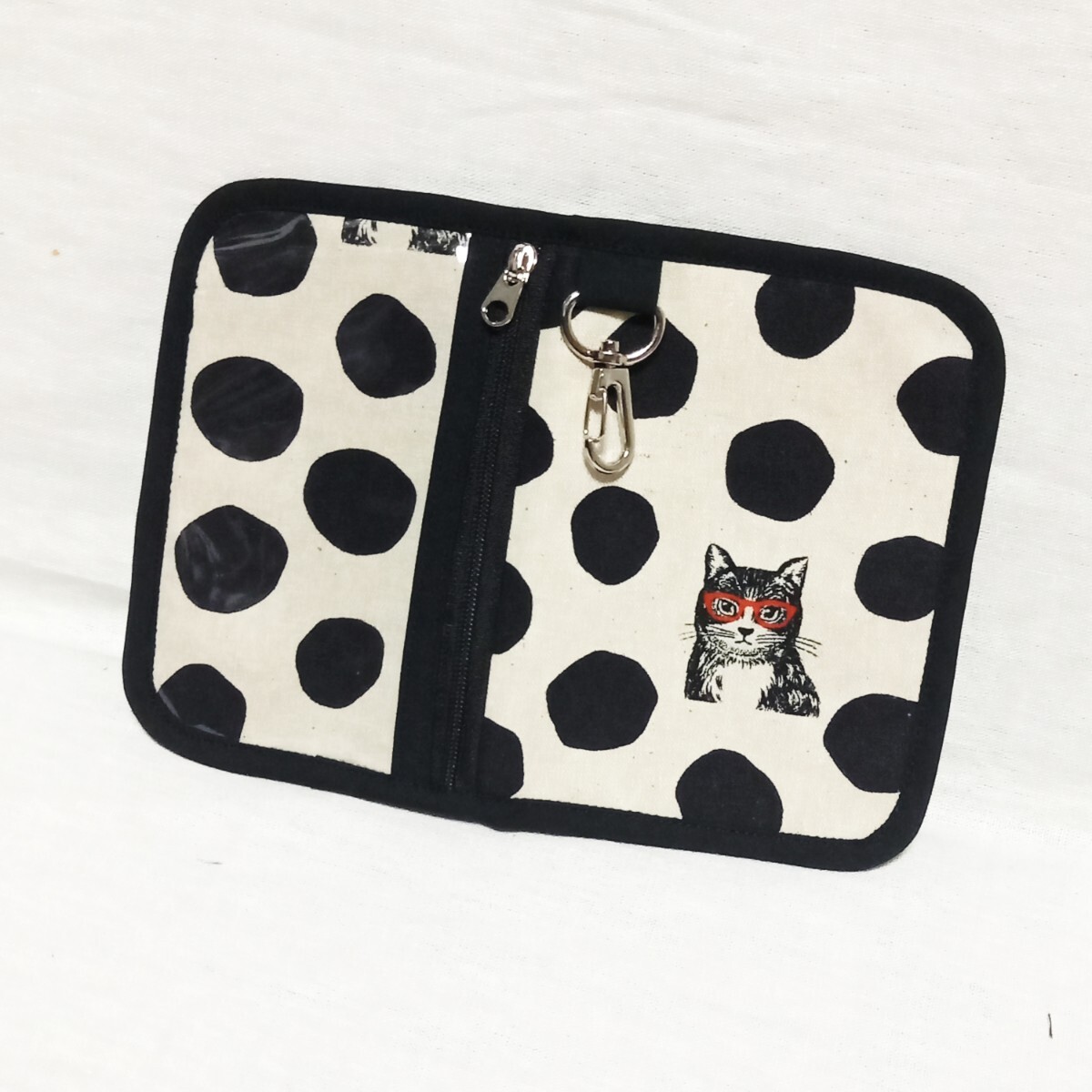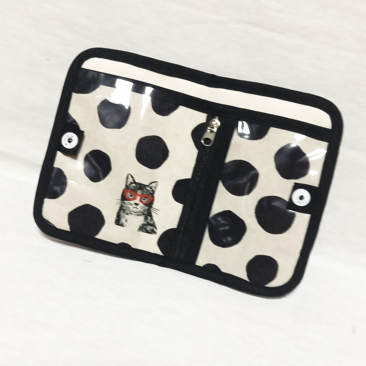 メイン生地は黒ドットにメガネを掛けたねこちゃんがワンポイントのエチノ生地