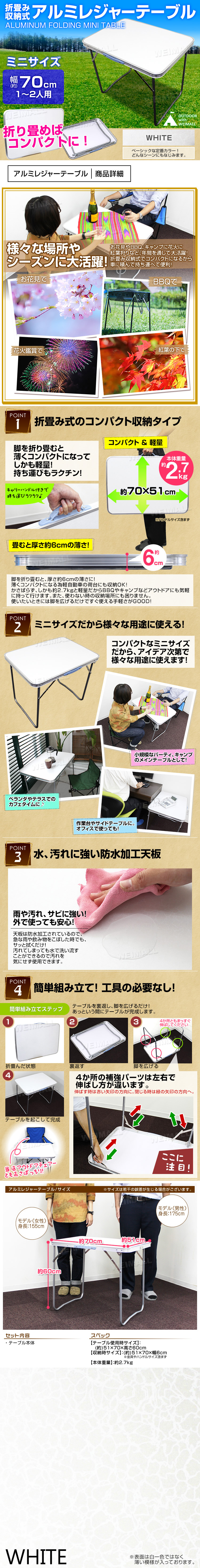 | アルミ製 折りたたみ式 アルミレジャーテーブル 横幅70×奥行51×高さ59cm カラー一覧 | |