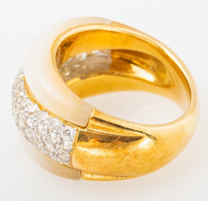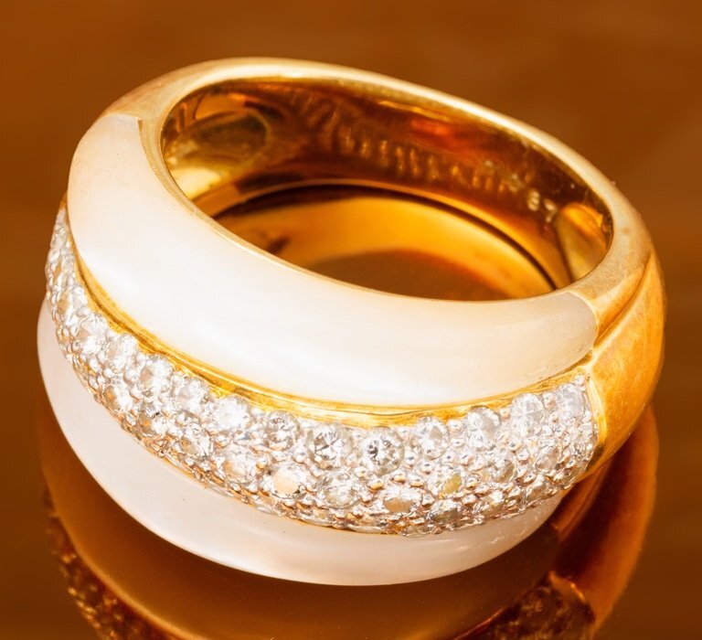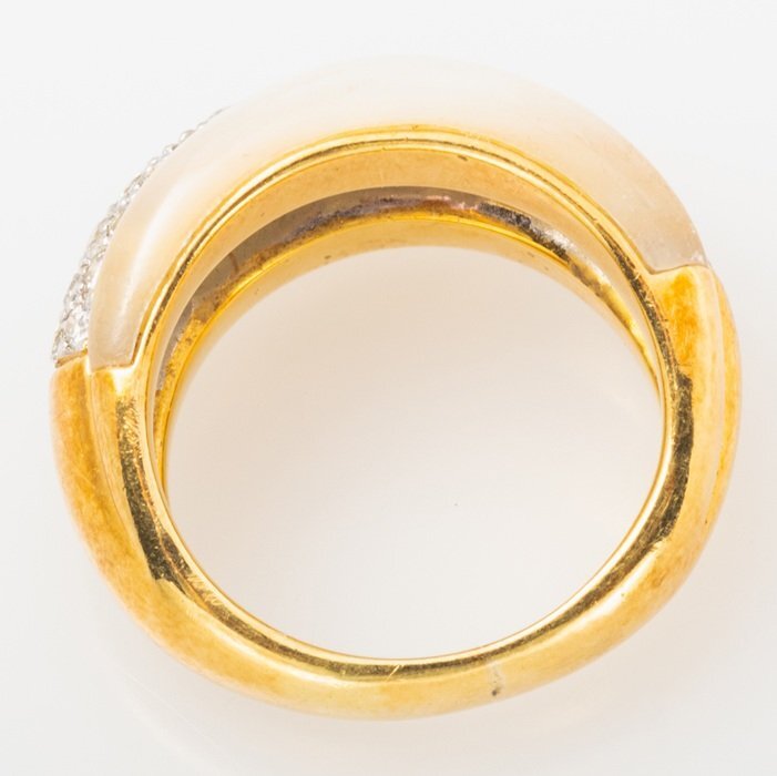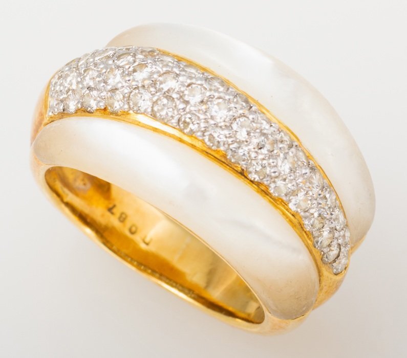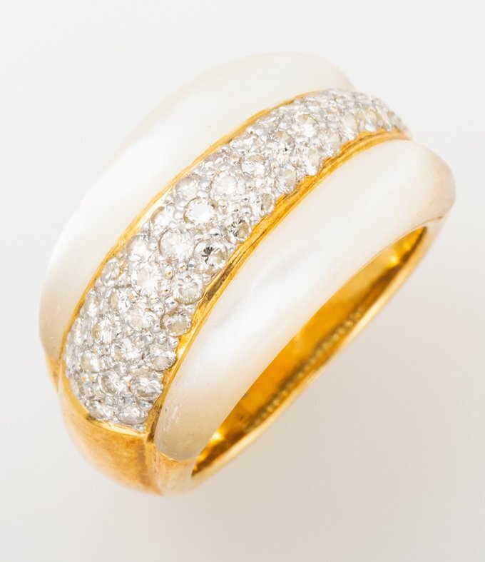 説明イエローゴールド(18金)の枠に、ホワイトシェル(白蝶貝)とダイヤモンドがセットされたデザインの指輪です。