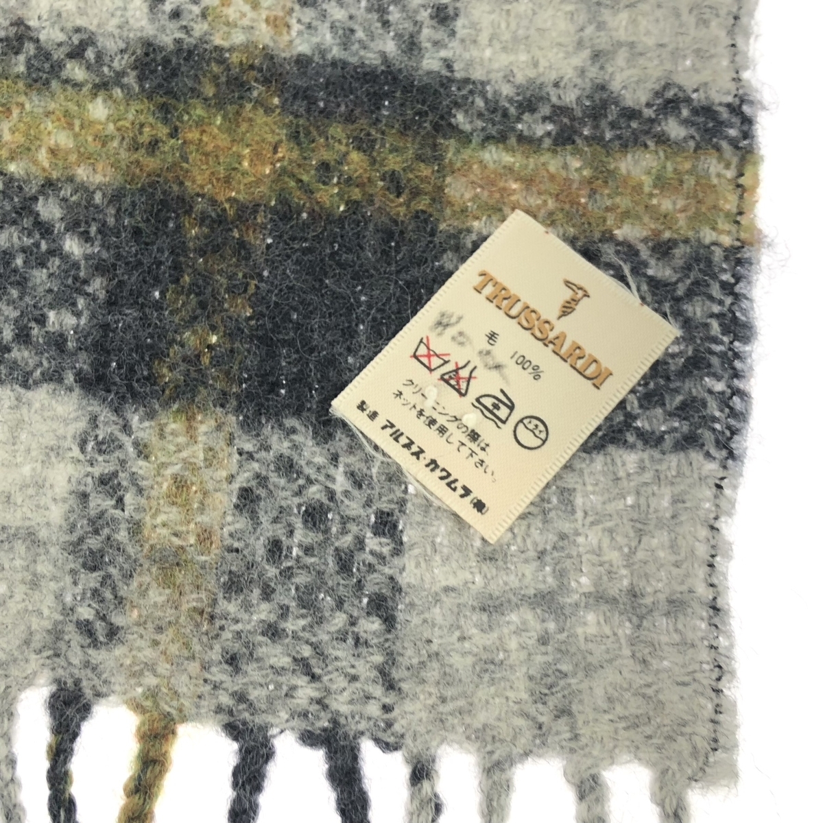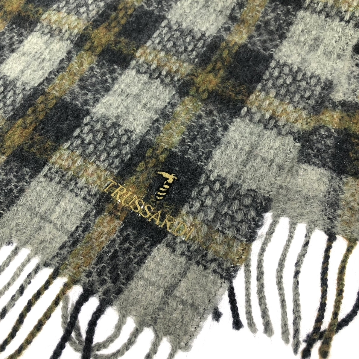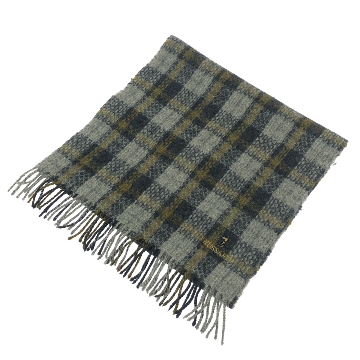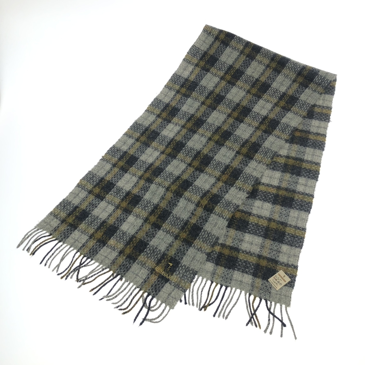 フリンジマフラー チェック/ロゴ刺繍/ウール |