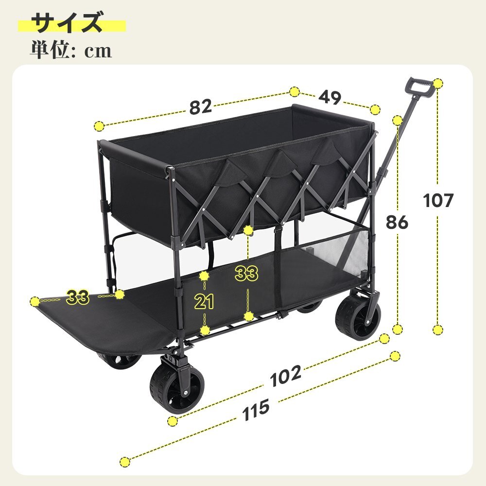 【抜群の安定感!超ワイドなスーパーワイド幅タイヤ!】ワゴンの前輪は360度回転します。小回りが利くので急な「曲がる」「回る」動きにスムーズについてきてストレスを感じさせん。操作性抜群!ロック機能付き 保管時や広げた状態で坂道などに置いておく際にも転がってしまうことなく安心※ロックする際は必ず左右両方のストッパーを下ろしてください。