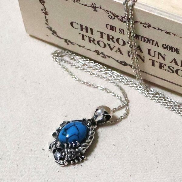 このシルバー925のペンダントは、力強いスコーピオン(サソリ)が大きなターコイズを抱きしめるデザインが特徴です。精緻なディテールと力強いフォルムが魅力的で、ネックレスとして身に着けることで、独自の存在感と力強さを感じることができます。ターコイズは、その美しい青色が魅力的で、見る者を引き寄せます。 スコーピオンは古代から「守護」「強さ」「変化」を象徴するモチーフとして広く認識されており、このペンダントは身に着ける人に力強い守護を与え、精神的な支えを感じさせてくれます。ターコイズは「旅の守護」「ヒーリング」を象徴し、エネルギーのバランスを整えるとされています。このデザインは、その強さと守護の象徴を兼ね備えた一品です。 【スコーピオン(サソリ)の意味】 スコーピオンは「変化」「再生」「自己防衛」を象徴する力強いモチーフです。その強い意志と不屈の精神が身に着ける人を守り、試練を乗り越える力を与えてくれます。ターコイズと組み合わせることで、内面の強さと癒しのエネルギーを最大限に引き出し、日常に勇気を与えてくれるアクセサリーとなります。 自分へのご褒美としても、大切な方への贈り物としてもぴったりなアイテム。シルバー925の上質な素材が、長く愛用できる証となります。 上質なシルバー925を使用したペンダント。シルバーの白いキラメキと洗練されたデザインで、日常使いから特別な日まで幅広くお楽しみいただけます。 プロフィールの確認お願いします。 ノーブランド商品なのでブランド品の様に高額ではなく、シルバーの価値に見合った価格で販売させて頂いています^^ ★商品詳細★ ・商品:ペンダントトップ(TOP) ・商品番号:SH1114na ・材質:シルバー925 ・重量:約10g ・サイズ:約37.8mm×19.8mm ※バチカンを含んだ全体の長さ ・バチカン内径 約8.6mm×6.9mm ※装飾石は天然石のため模様が写真と異なる場合があります。 商品はTOPのみの販売となりますので、写真のチェーンをご希望あれば、同梱条件で特別価格にて販売させて頂きます。 ★購入時の保障について★ お送りした商品が商品詳細記載と違いがあれば、全額返品返金にてさせて頂きます。 万一郵送時にトラブルがあった場合にも、責任をもって対応させて頂きます。 ご安心して購入ください。