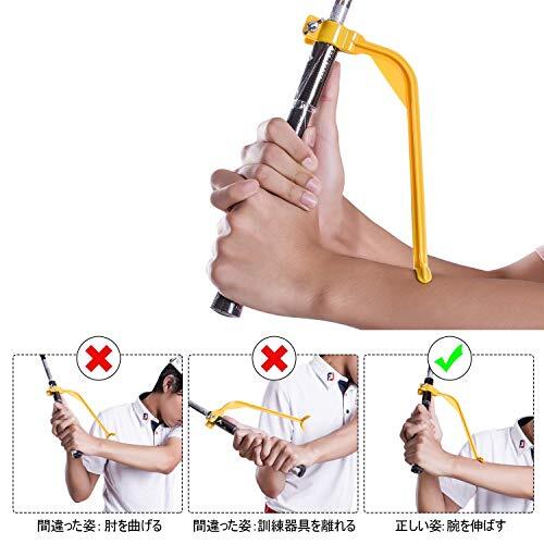 【肘ブレース】この肘ブレースはスイングラジアンの増加に役立つので優れた効率、精度、距離でボールを打つことができる。初心者はスイングの過程に左肘を曲げてみごとな打ちができない。正しいスイング姿勢は左腕が直線状態で動き、肘ブレースで曲がると警報の声が鳴る。それによって初心者はミスをすぐに知って左肘の正しい姿勢を保つことに注意することができる。