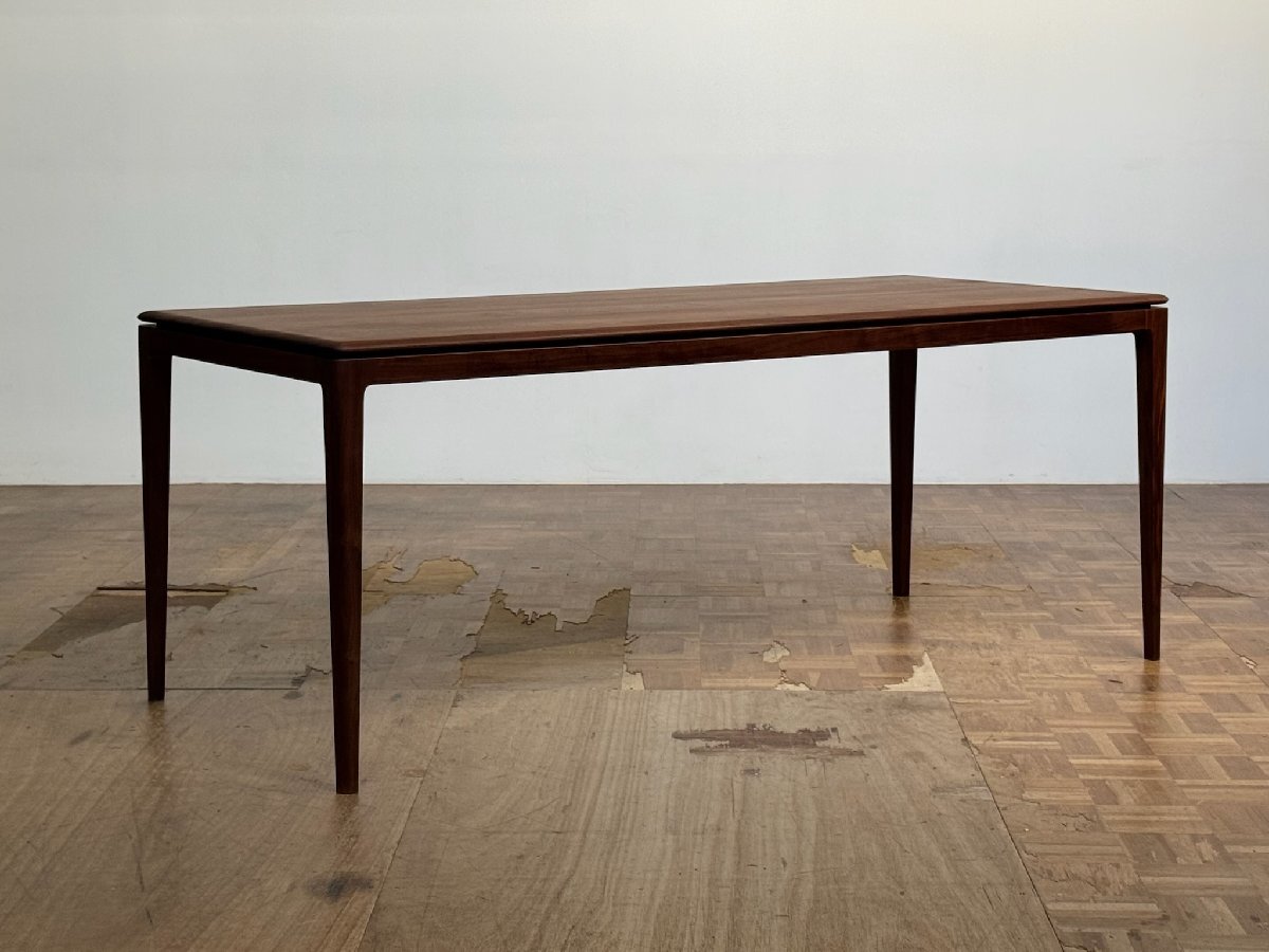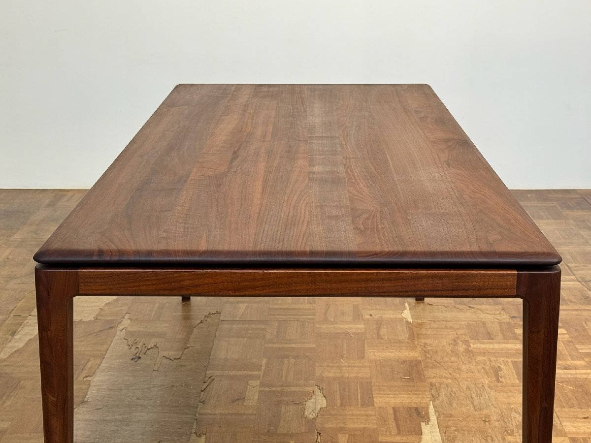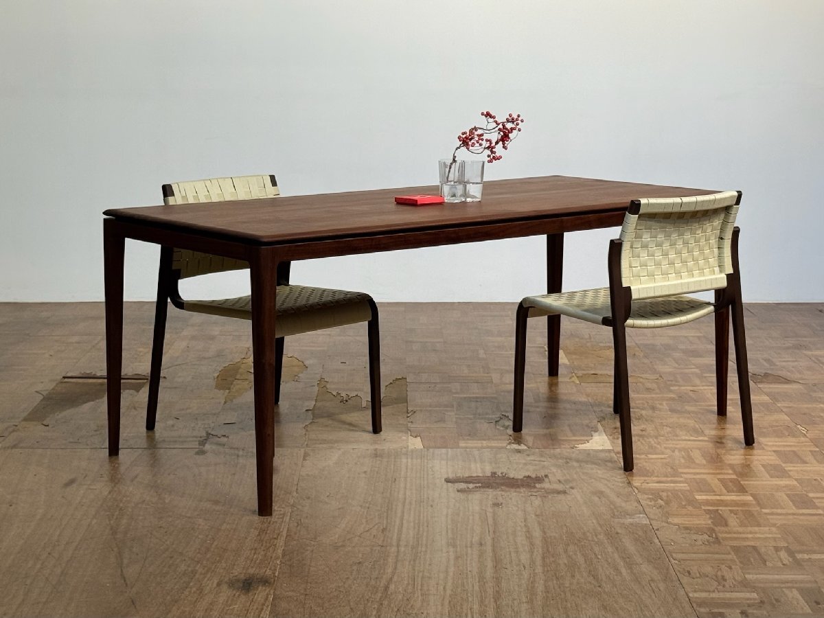 ブランドの誇る最高品質ウォールナット無垢材を、天板を構成するテーブルトップとテーブルフレームをレッグスとの連続性を整えて切り出して組み合わせ、上下の厚みとアールの曲線のコントラストで静かに飾り上げた、ニホンの木工クラフツマンシップの粋をインダストリアルデザインに巧みに踏襲する Time & Style / タイムアンドスタイルならではの大セラーダイニングテーブル。Time & Style より。