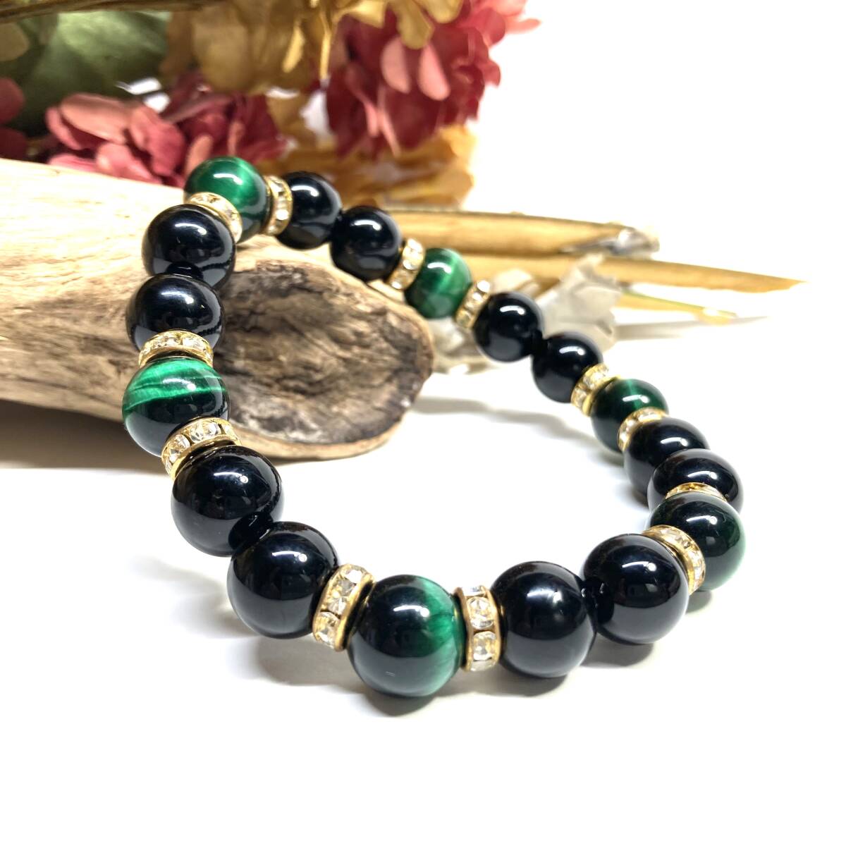 こちらは、モリオンとグリーンタイガーアイを組み合わせたパワーストーンブレスレットです。間にはロンデルを挟み高級感あるデザインに仕上げております。石大きさは腕にも馴染みやすいように10mm玉で内径約18cm(伸可能)です。(サイズ変更の場合は取引ナビにてご連絡をお願いします。) 数に限りがございますので気になる方はお早めにどうぞ。