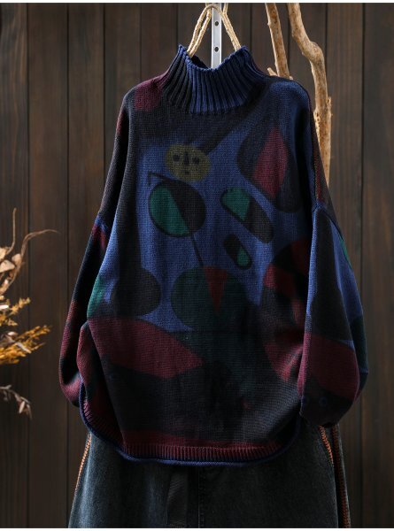 mn 2510 ニット セーター チュニック トップス ゆったり 綿100% ナチュラル ハーフネック プリント柄1