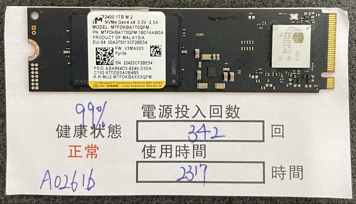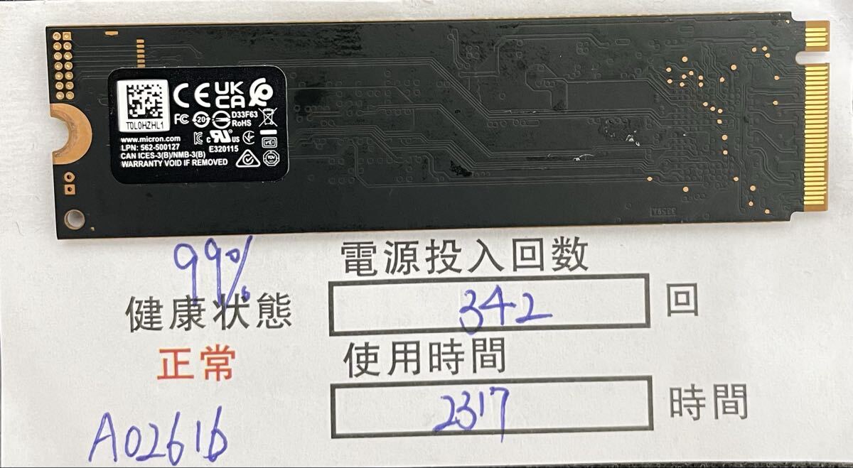 A02616/ 中古品/M.2 NVME 2280 SSD/Micron /1TB/動作確認済み/返品返金対応/納品書発行可(商品説明文ご確認下さい)