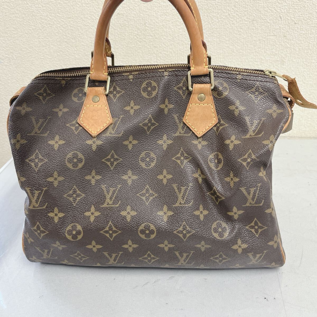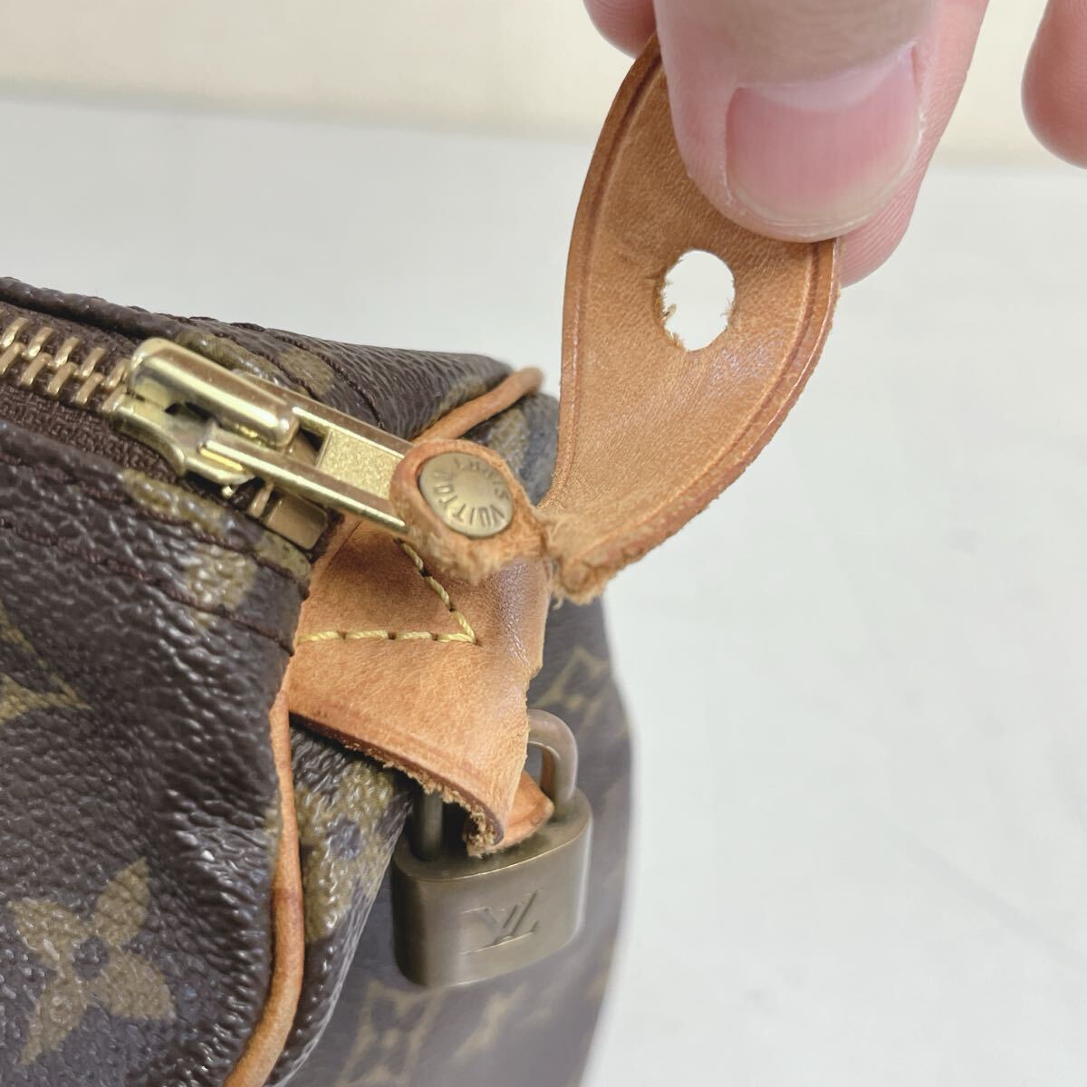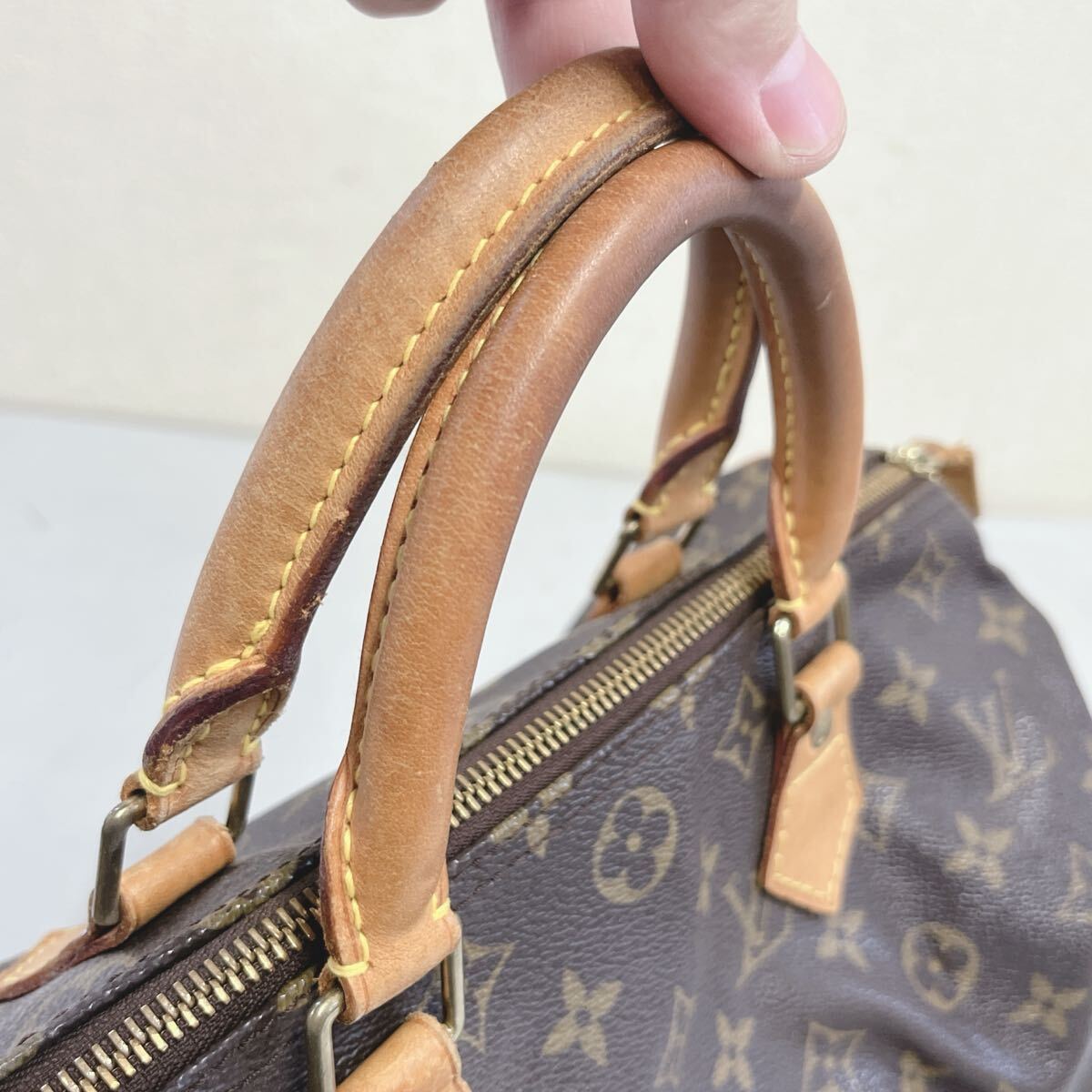 ヌメ革に焼け、シミ、スレがございます。